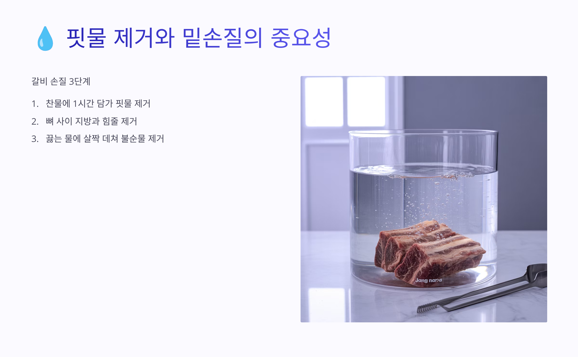 갈비찜을 할 때 고기 손질이 가장 먼저이자 가장 중요한 과정이에요. 특히 핏물을 제대로 제거하지 않으면 잡내가 심하게 올라오고, 아무리 좋은 양념을 써도 본연의 맛이 망가질 수 있어요.