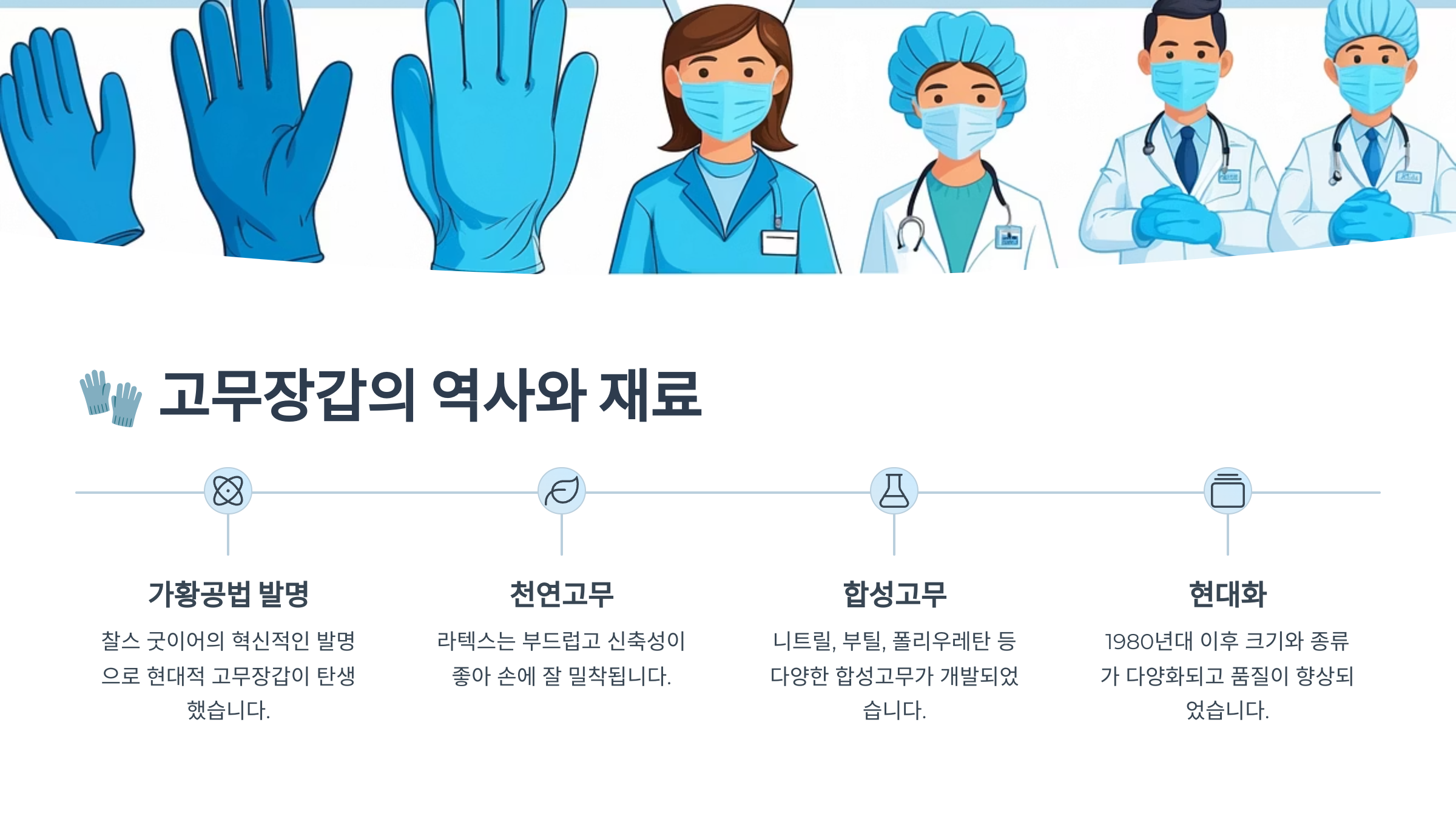 고무장갑은 본래 의료 현장에서 위생을 지키기 위해 개발되었어요. 1900년대 초반에는 천연 고무인 라텍스로 만들어진 제품이 많았답니다. 라텍스는 부드럽고 밀착력이 좋아서 세세한 작업에 유리했지만, 알레르기를 일으키기도 했어요. 이후 합성고무와 비닐소재 등이 등장하며 알레르기 문제를 보완했지요.