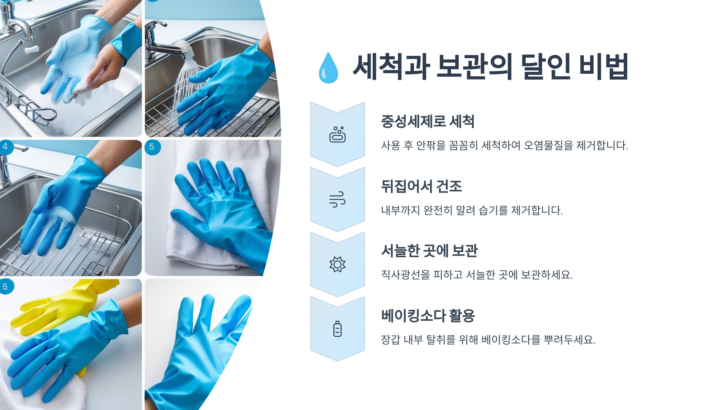 세척과 보관을 조금만 신경 써도, 고무장갑이 훨씬 더 위생적이고 오래 쓸 수 있어요. 👍