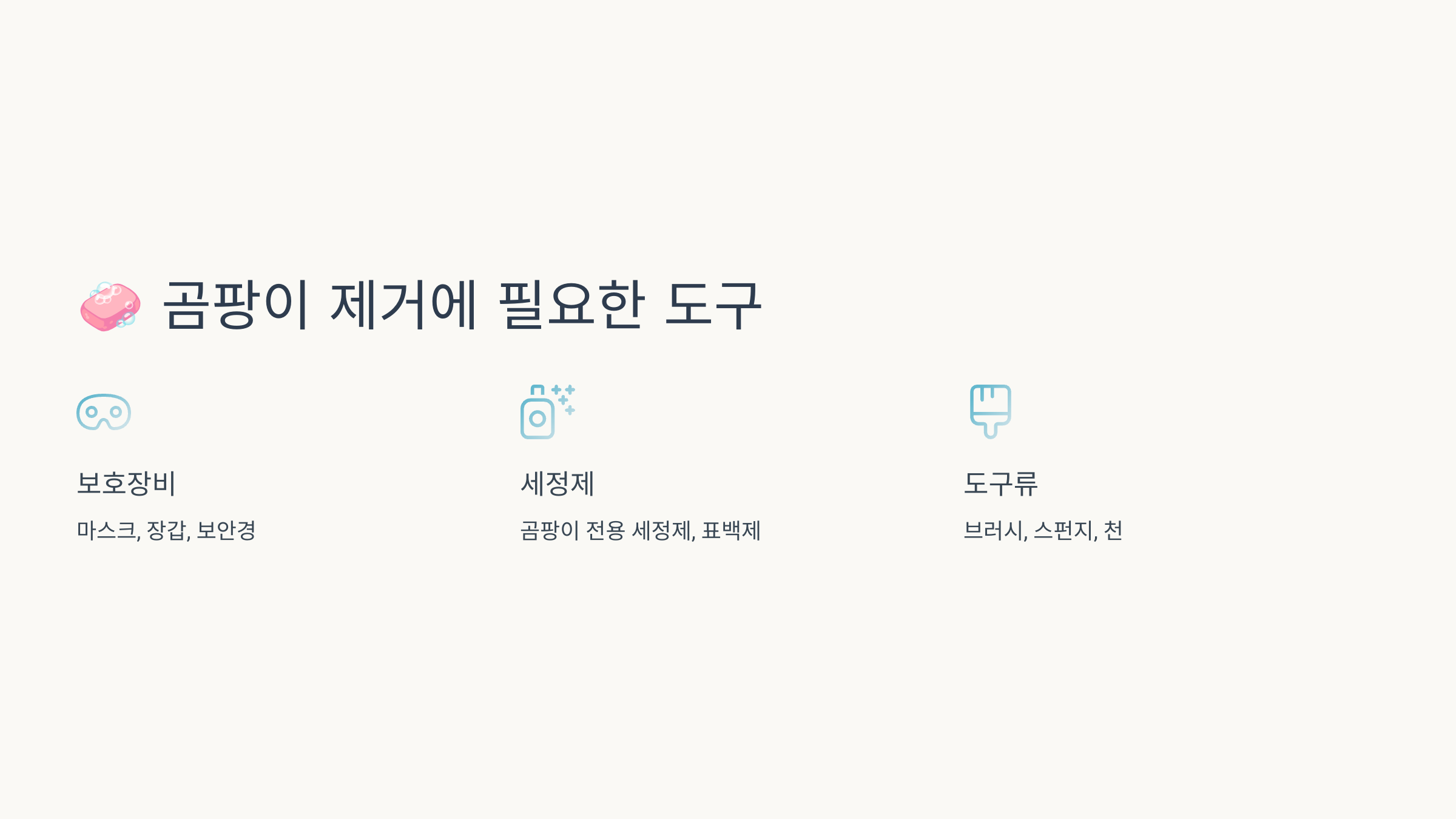 곰팡이 제거는 그냥 물만 부어 닦는다고 끝나지 않아요. 곰팡이의 뿌리는 생각보다 깊고, 표면만 닦으면 며칠 안 가서 다시 퍼지거든요. 그래서 기본적인 청소도구 외에 몇 가지 살균 도구가 필요해요.