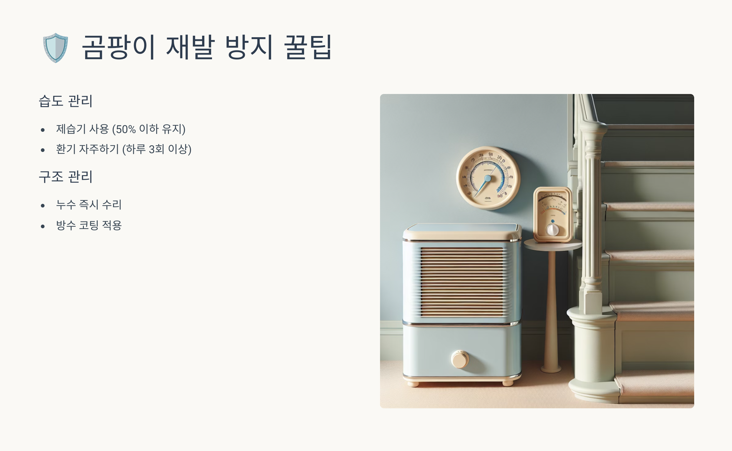 곰팡이를 제거했더라도 방심하면 안 돼요. 계단이라는 구조상 다시 습기가 차기 쉬워서 재발률이 꽤 높거든요. 그래서 청소만큼 중요한 게 '지속적인 관리'랍니다.