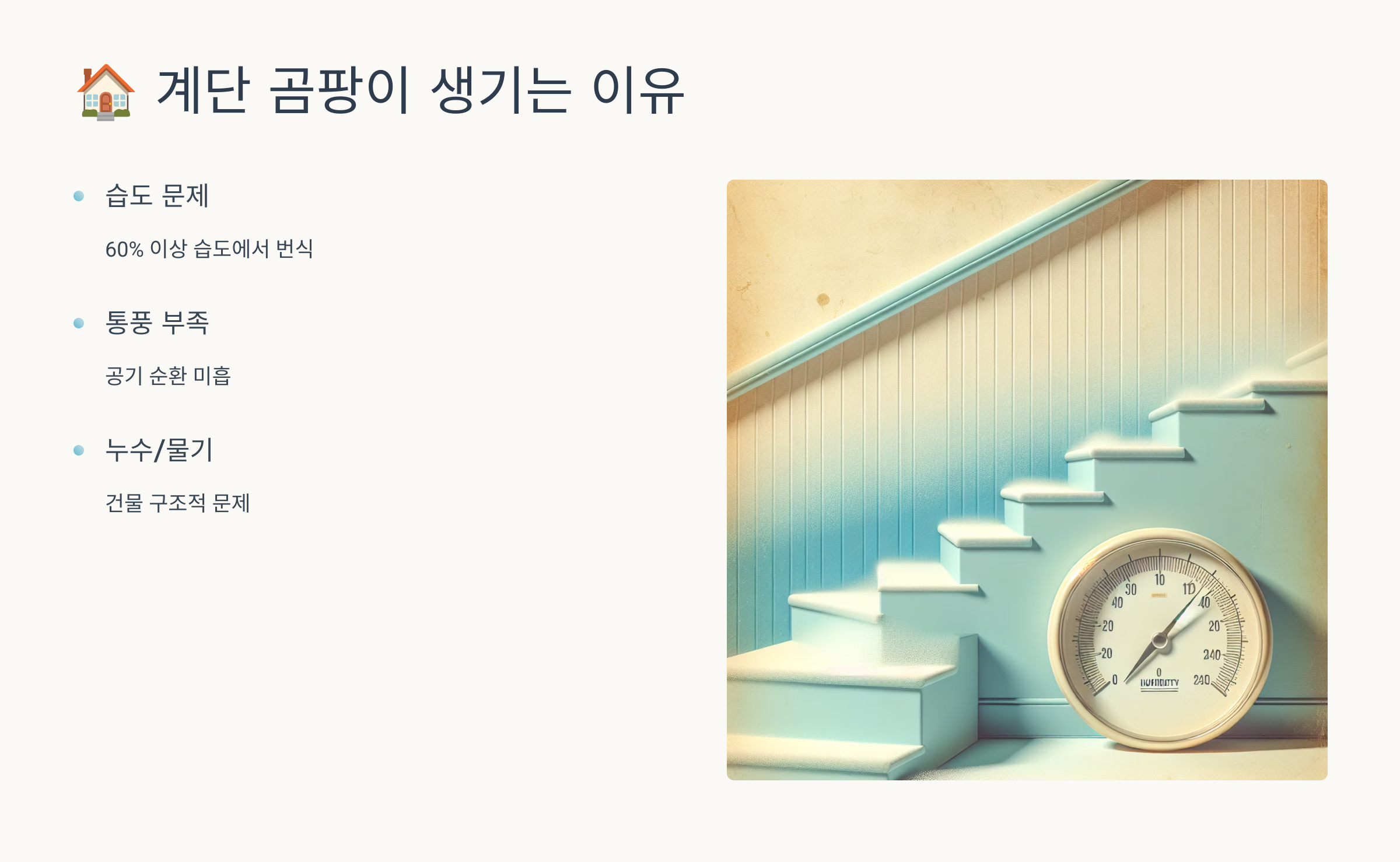 곰팡이는 습도와 온도의 영향을 가장 많이 받는 유기물이에요. 특히 계단처럼 외부와 내부가 연결된 구조는 공기의 흐름이 일정하지 않아, 습기 정체가 쉽게 발생하죠.