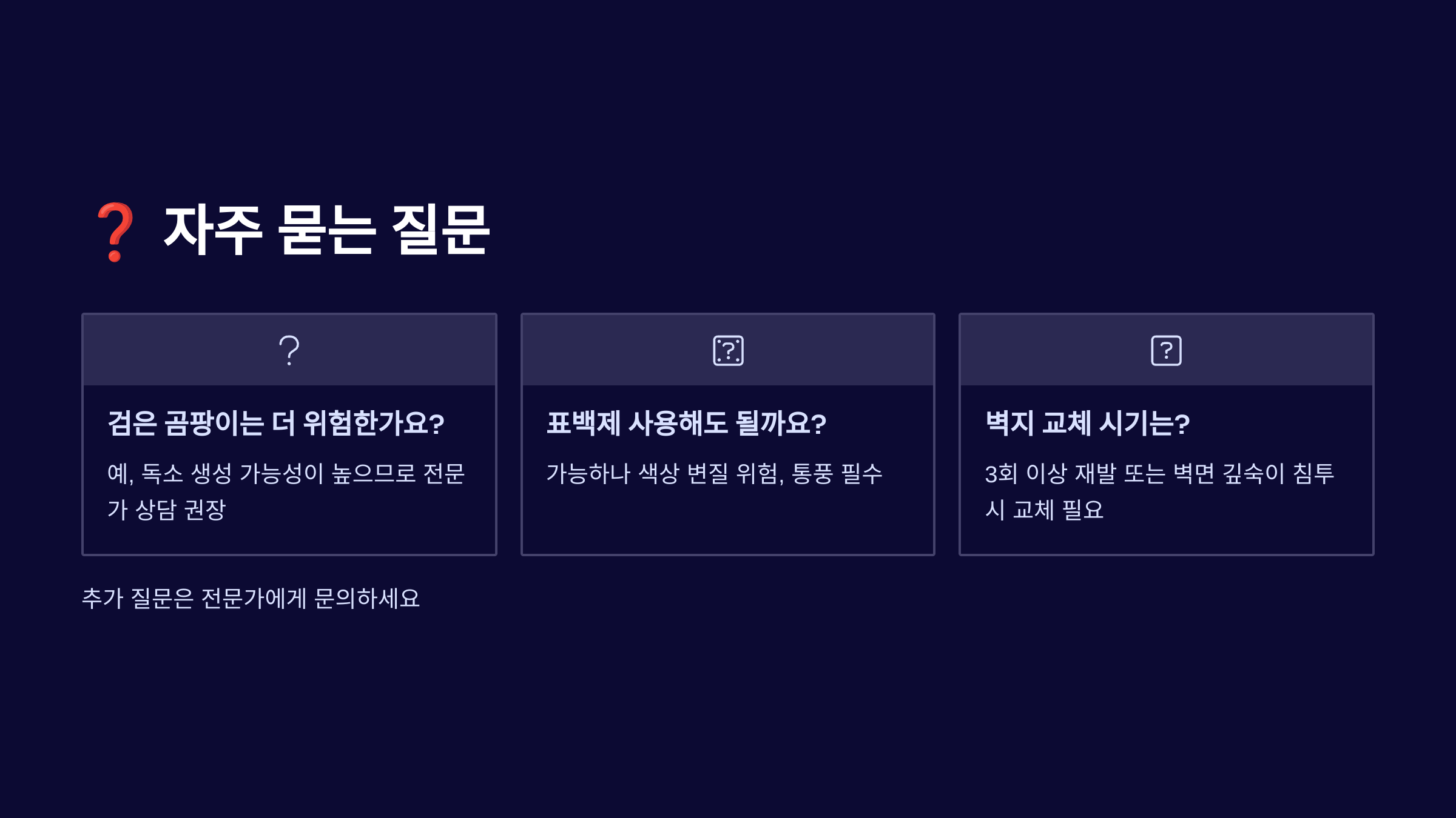 A3. 환기, 제습, 단열 개선, 방균 코팅제 사용이 중요해요. 습도 60% 이하로 유지하면 재발 확률을 크게 줄일 수 있어요.