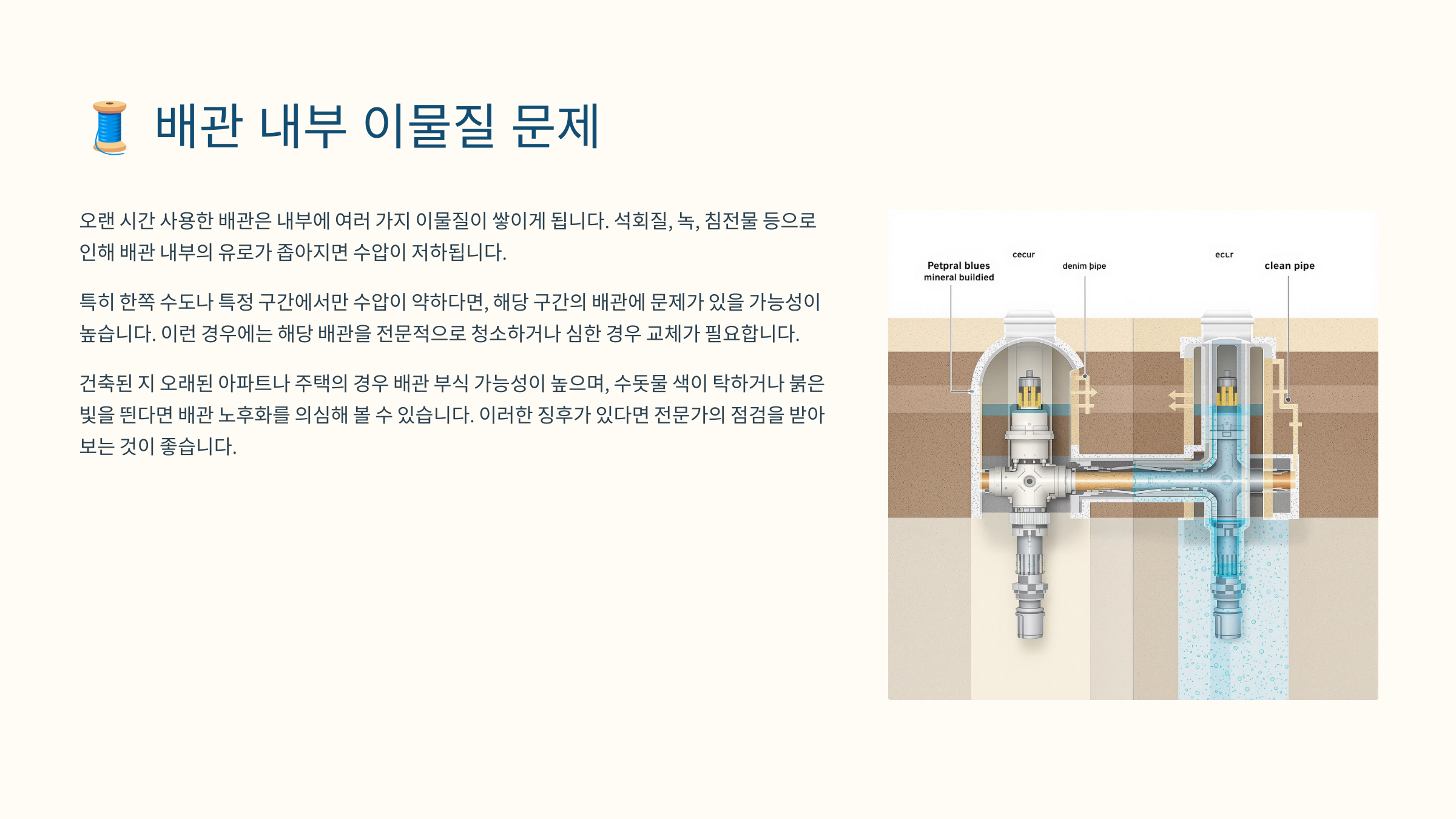 필터도 깨끗하고 밸브도 잘 열려 있는데 여전히 물줄기가 약하다면, 이제는 배관 내부를 의심해봐야 해요. 특히 오래된 아파트나 단독주택은 시간이 지나면서 배관 안쪽에 녹이나 석회질 같은 이물질이 쌓이는 일이 많거든요.