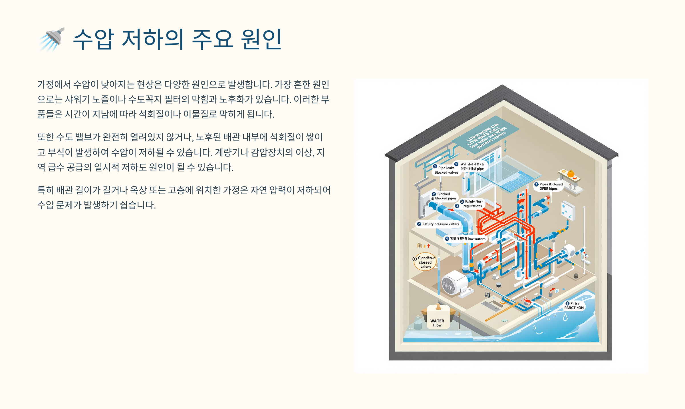 | 배관 내부 이물질 | 전체적으로 수압 약함 | 전문가 점검 필요 |