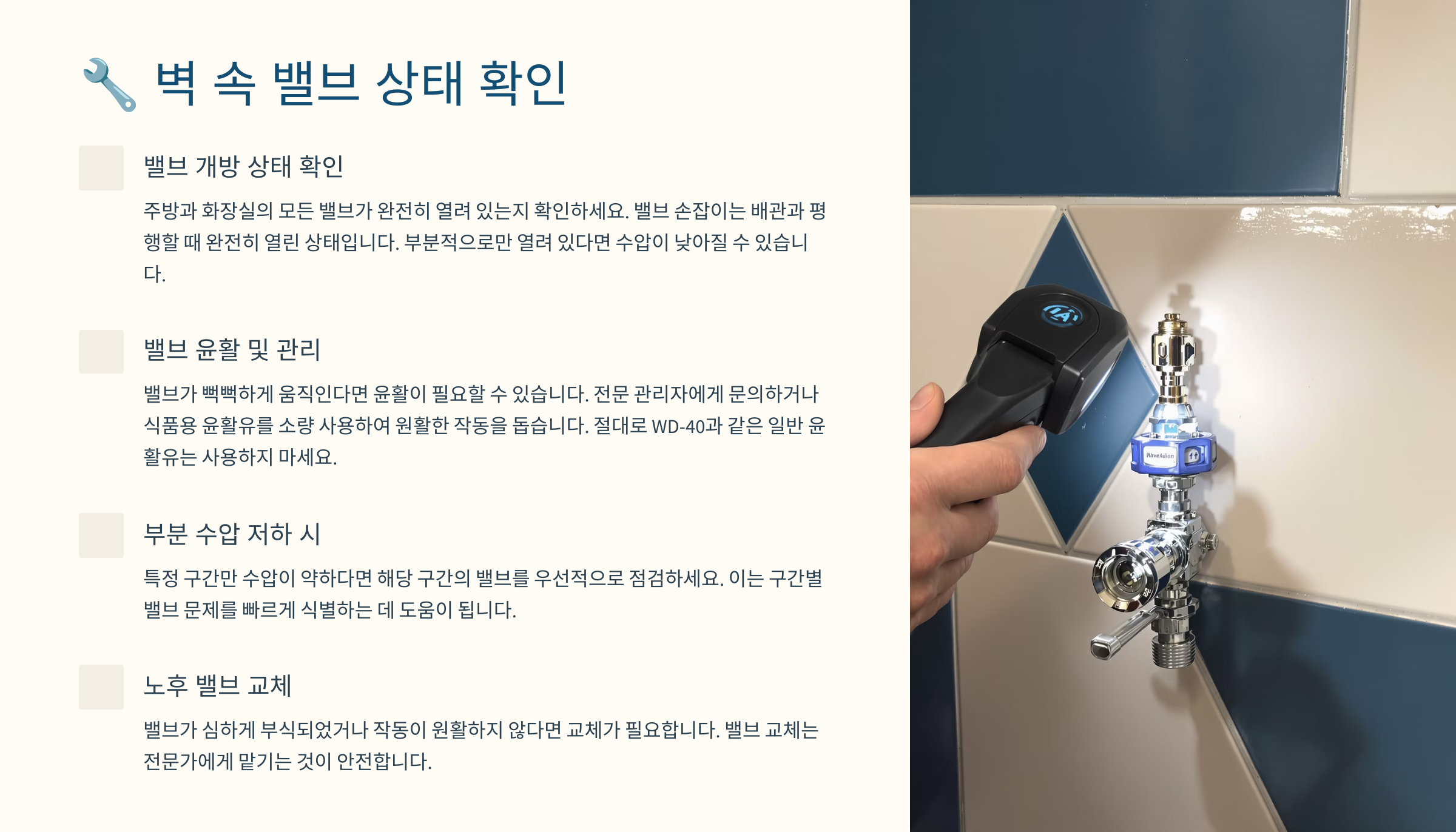 밸브는 수압을 조절할 수 있는 핵심 장치예요. 간단한 확인만으로도 갑자기 강해진 물줄기를 경험할 수 있죠. 특히 새 입주한 아파트나, 공사 후 집이라면 누군가 잠가둔 걸 수도 있으니 꼭 확인해보세요!