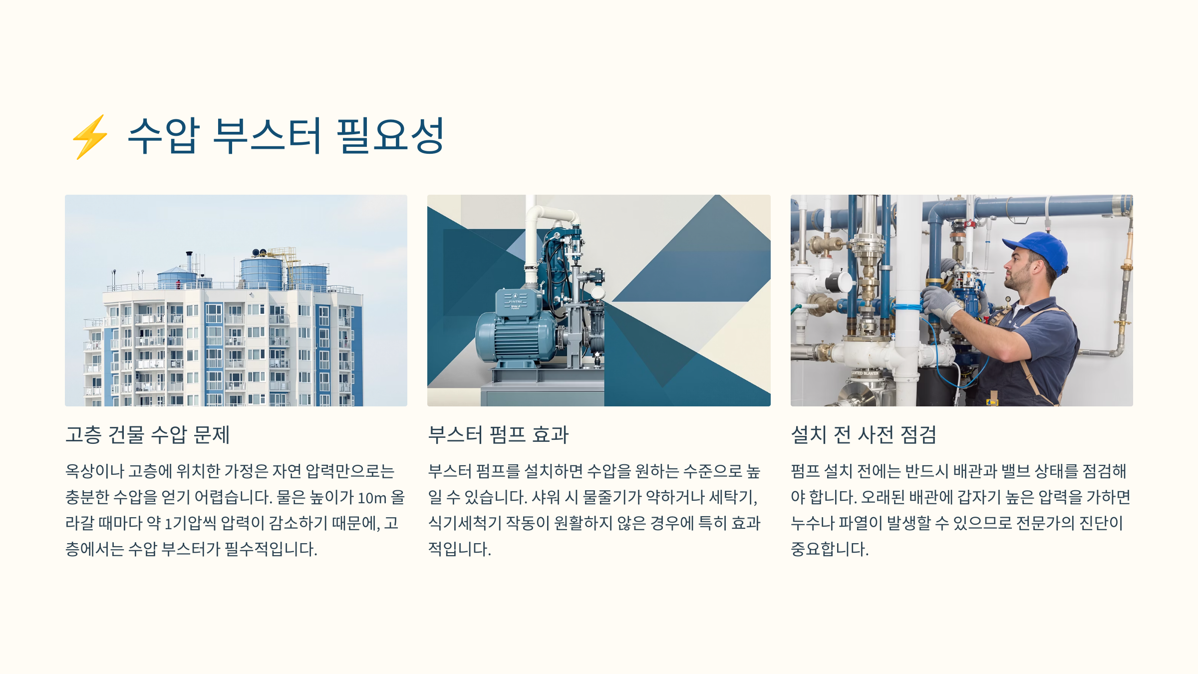 수압 부스터는 설치 후 바로 효과를 확인할 수 있어요. 설치 전에 해당 수도 제품이 부스터 설치를 지원하는지 확인하고, 가능하면 호환 제품을 사용해야 해요. 인터넷 구매 후 셀프로 설치하는 분들도 많지만, 메인 배관형은 전문가에게 맡기는 게 안전하답니다.