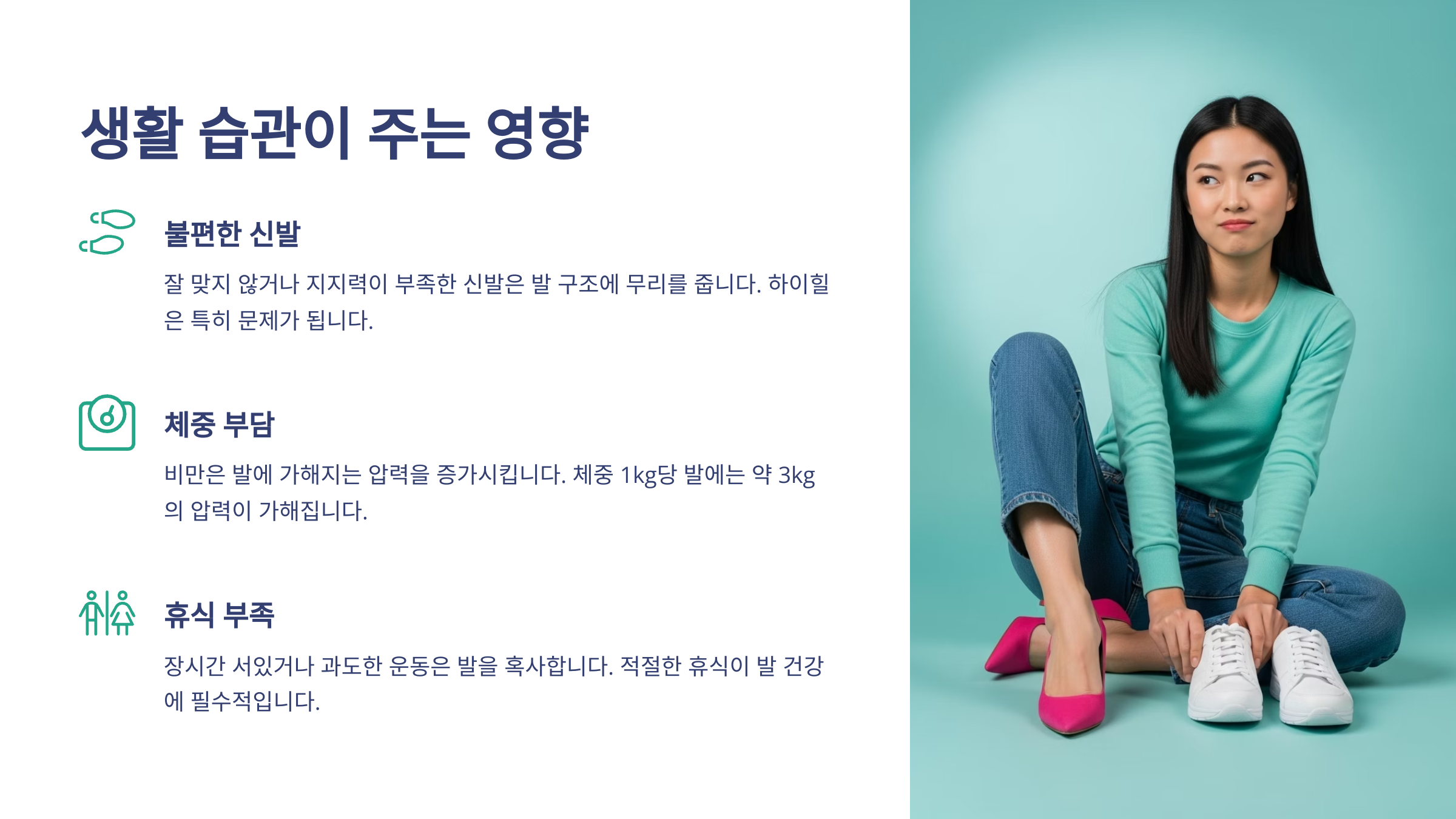 발바닥 통증은 단순히 구조적인 문제만으로 생기지 않아요. 우리가 매일 반복하는 생활 습관이 통증의 근본적인 원인이 되는 경우도 많답니다. 특히 자세, 걸음걸이, 신발 선택은 발 건강에 직접적인 영향을 줘요.