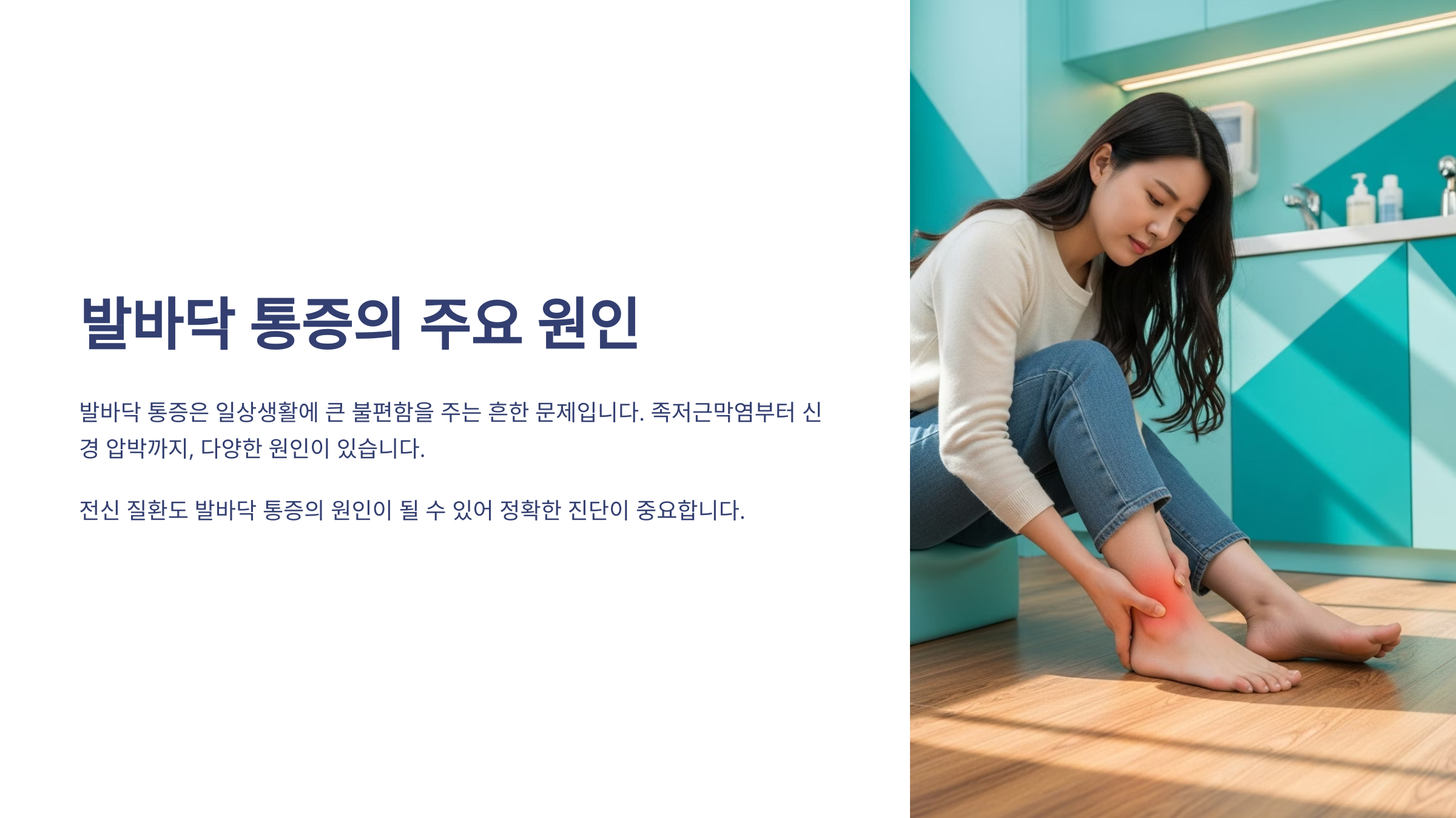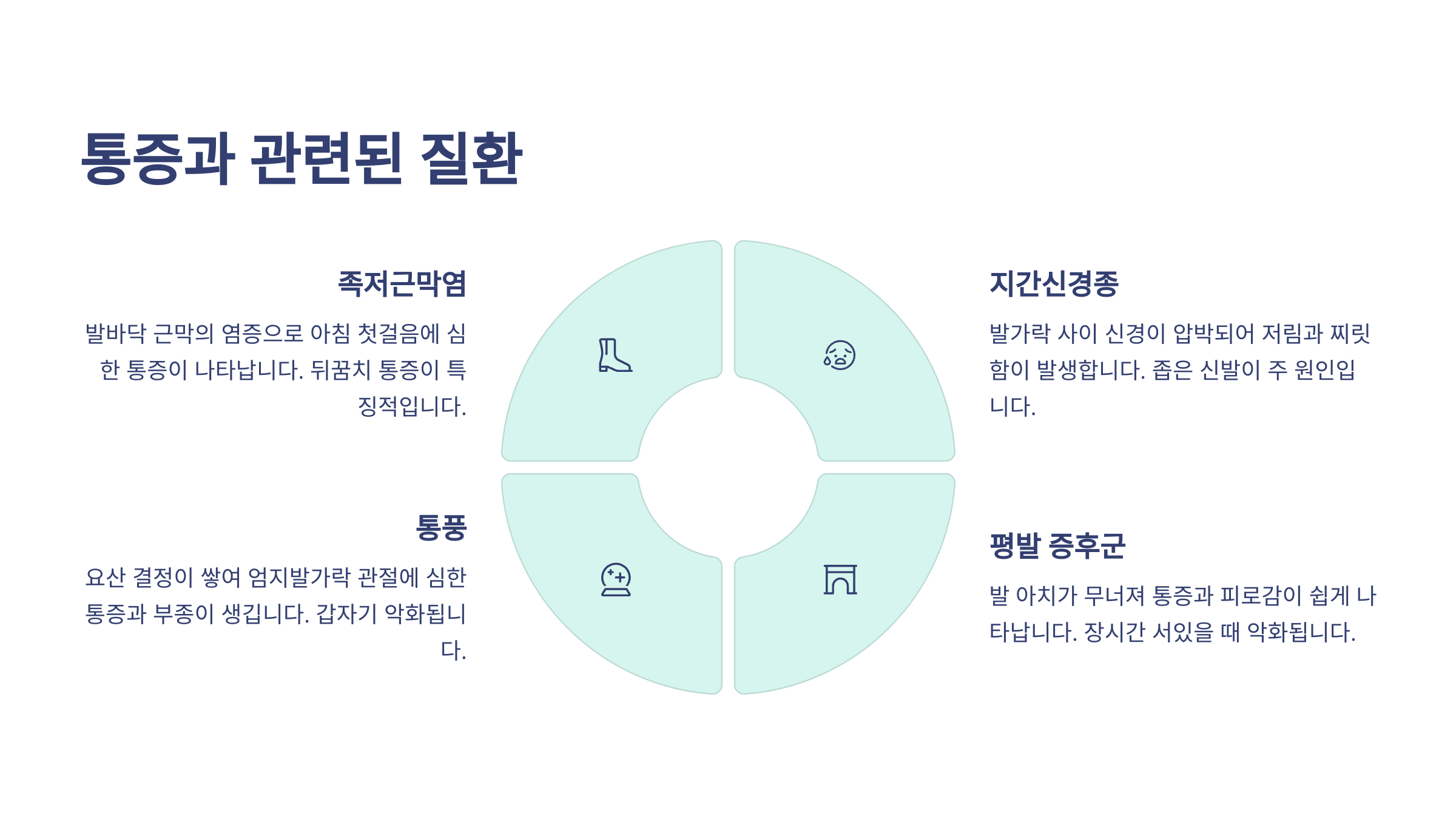 발바닥 통증은 단순한 피로나 잘못된 습관 외에도, 특정 질환에 의해 발생하는 경우가 많아요. 특히 만성적으로 반복되거나 아침 첫 걸음부터 통증이 심하다면, 질병 가능성을 반드시 의심해봐야 해요.