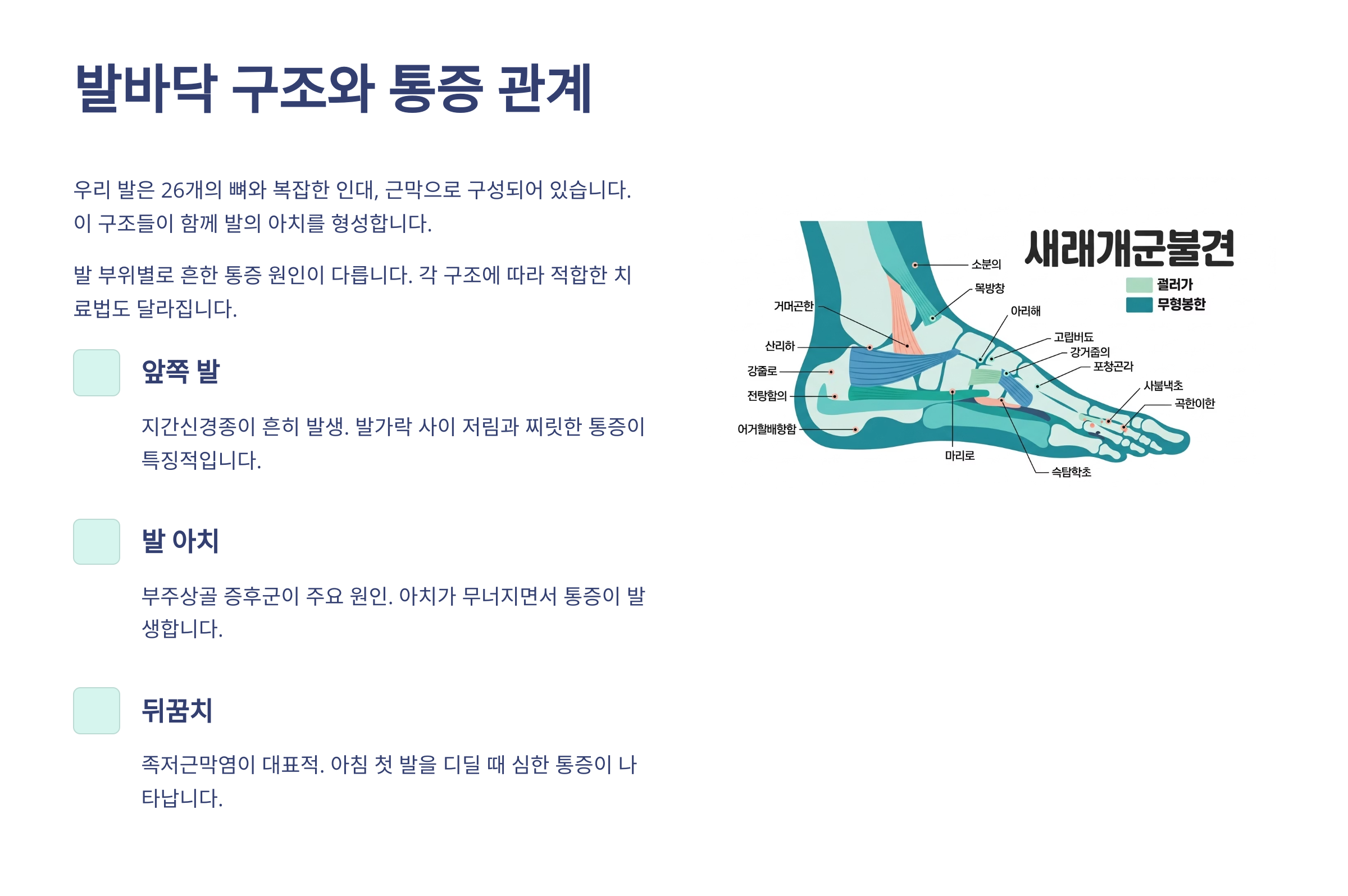 또한 발뒤꿈치 부근의 '족저근막'과 '종골' 부위는 발바닥의 하중을 가장 많이 받는 곳이기 때문에, 반복적인 자극이나 염증이 쉽게 발생해요. 따라서 구조적 이해는 통증 원인을 정확히 파악하는 데 매우 중요해요.