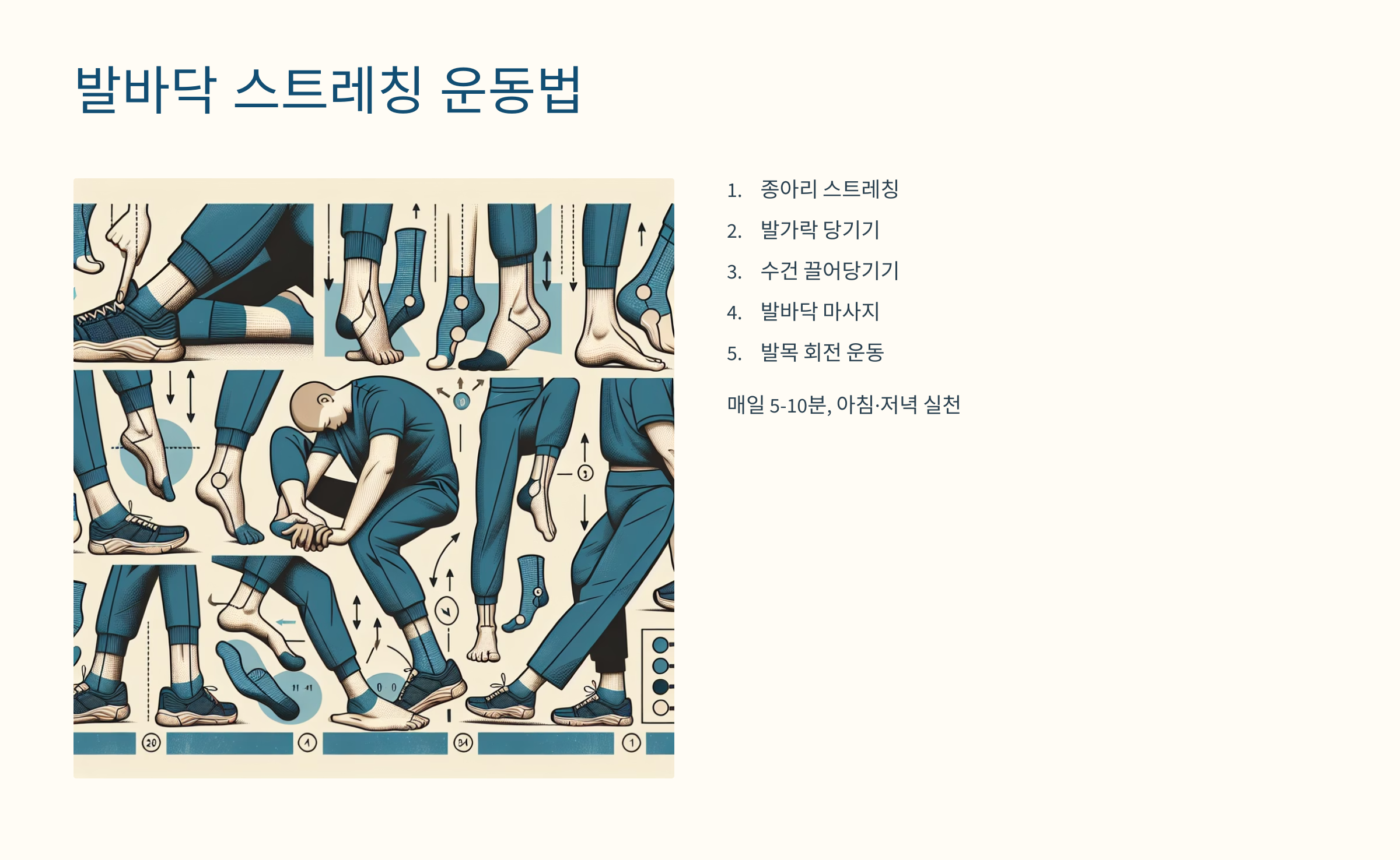 운동은 짧게라도 매일 하는 게 가장 중요해요. 하루 5분만 투자해도 피로 해소는 물론, 발바닥 통증이 눈에 띄게 줄어든답니다. 꾸준함이 곧 해답이에요! 🧘♂️