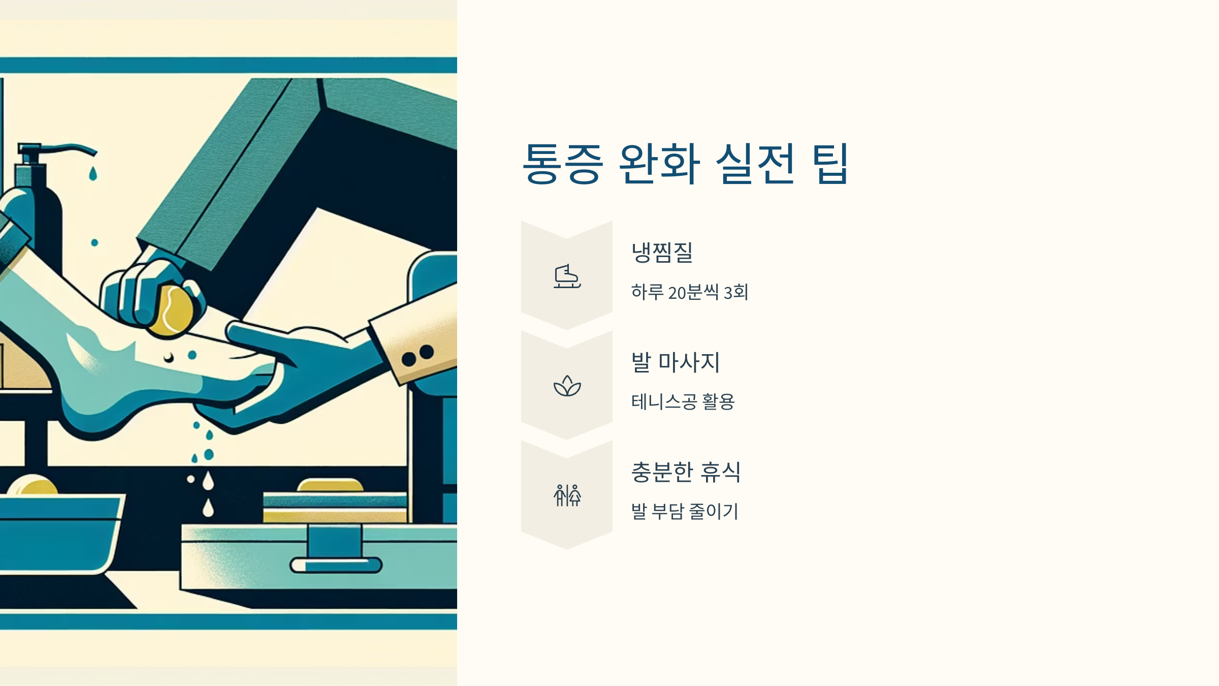 세 번째는 ‘냉찜질과 온찜질’ 번갈아 하기예요. 냉찜질은 염증을 가라앉히고, 온찜질은 긴장을 풀어줘요. 발을 하루 종일 사용했다면 자기 전에 번갈아 가며 찜질해주는 루틴을 만들면 정말 좋아요.