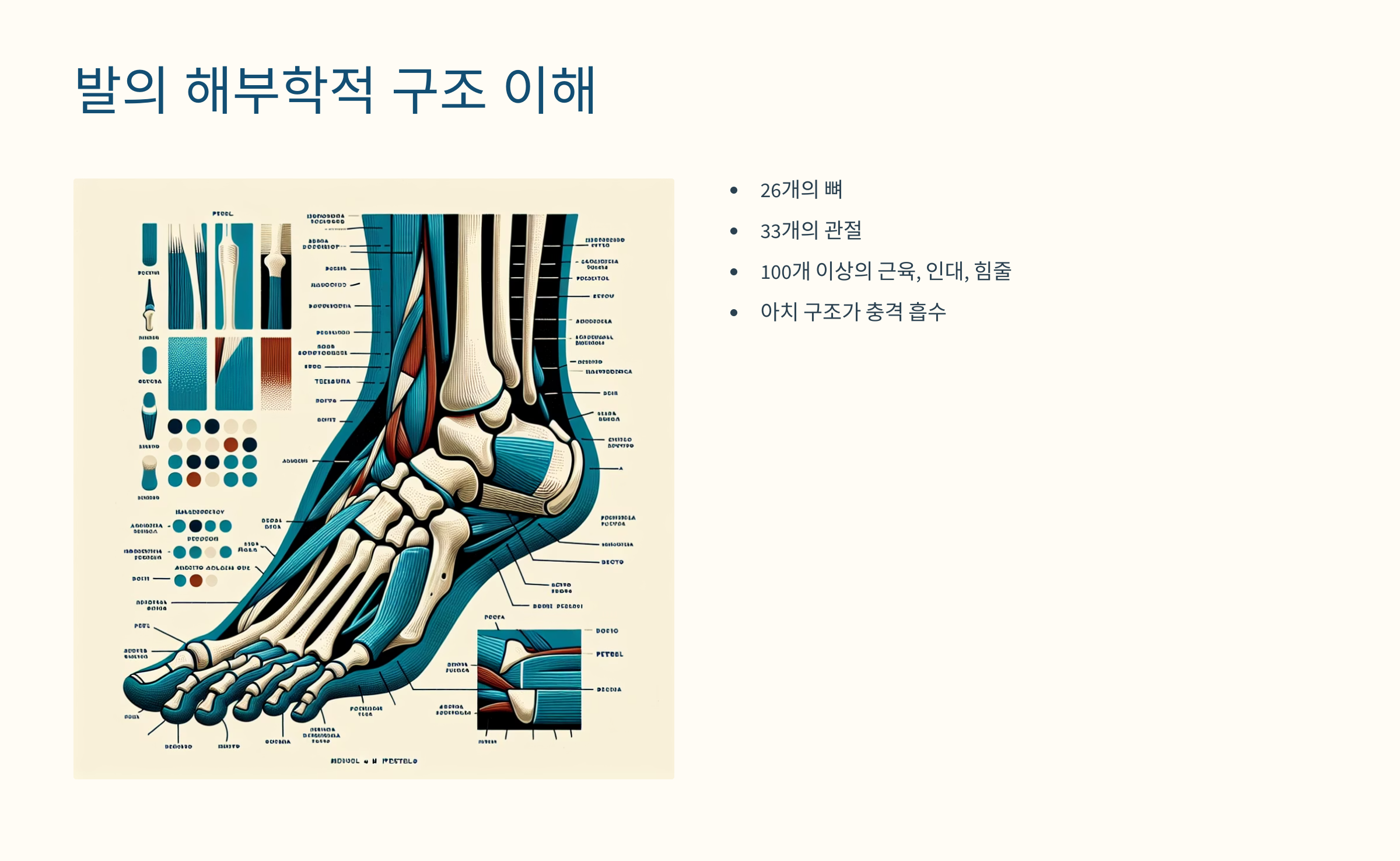 발은 겉보기엔 작고 단순해 보일 수 있지만, 실제로는 26개의 뼈, 33개의 관절, 100개 이상의 인대와 근육으로 이뤄져 있어요. 생각보다 굉장히 복잡하고 정교한 구조를 가진 기관이에요.