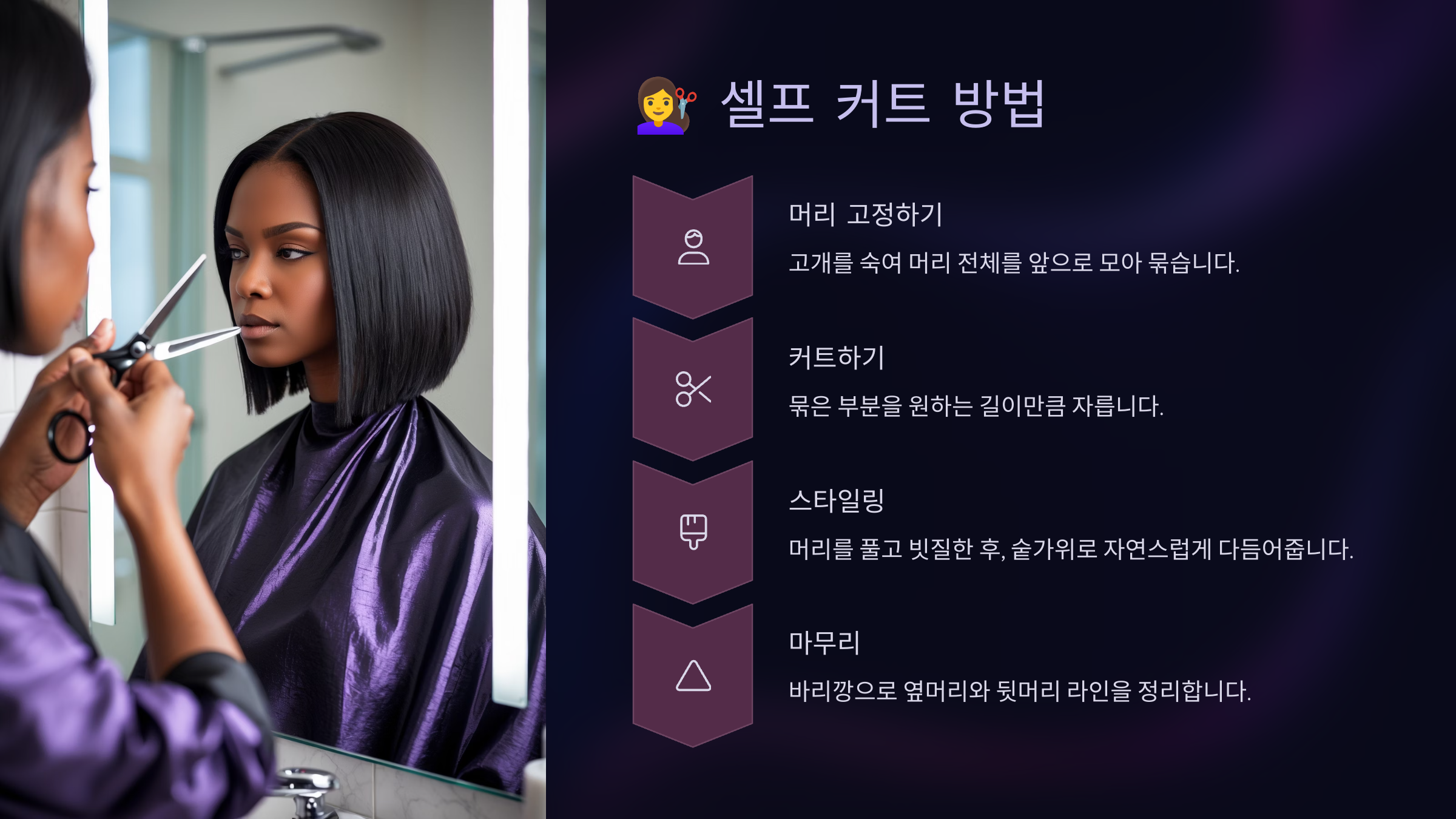 이렇게 차근차근 단계를 나눠서 셀프커트를 하면, 전문가처럼 멋진 결과를 얻을 수 있답니다! 처음에는 어렵게 느껴질 수 있지만, 조금씩 연습하면 누구나 할 수 있어요. 😉