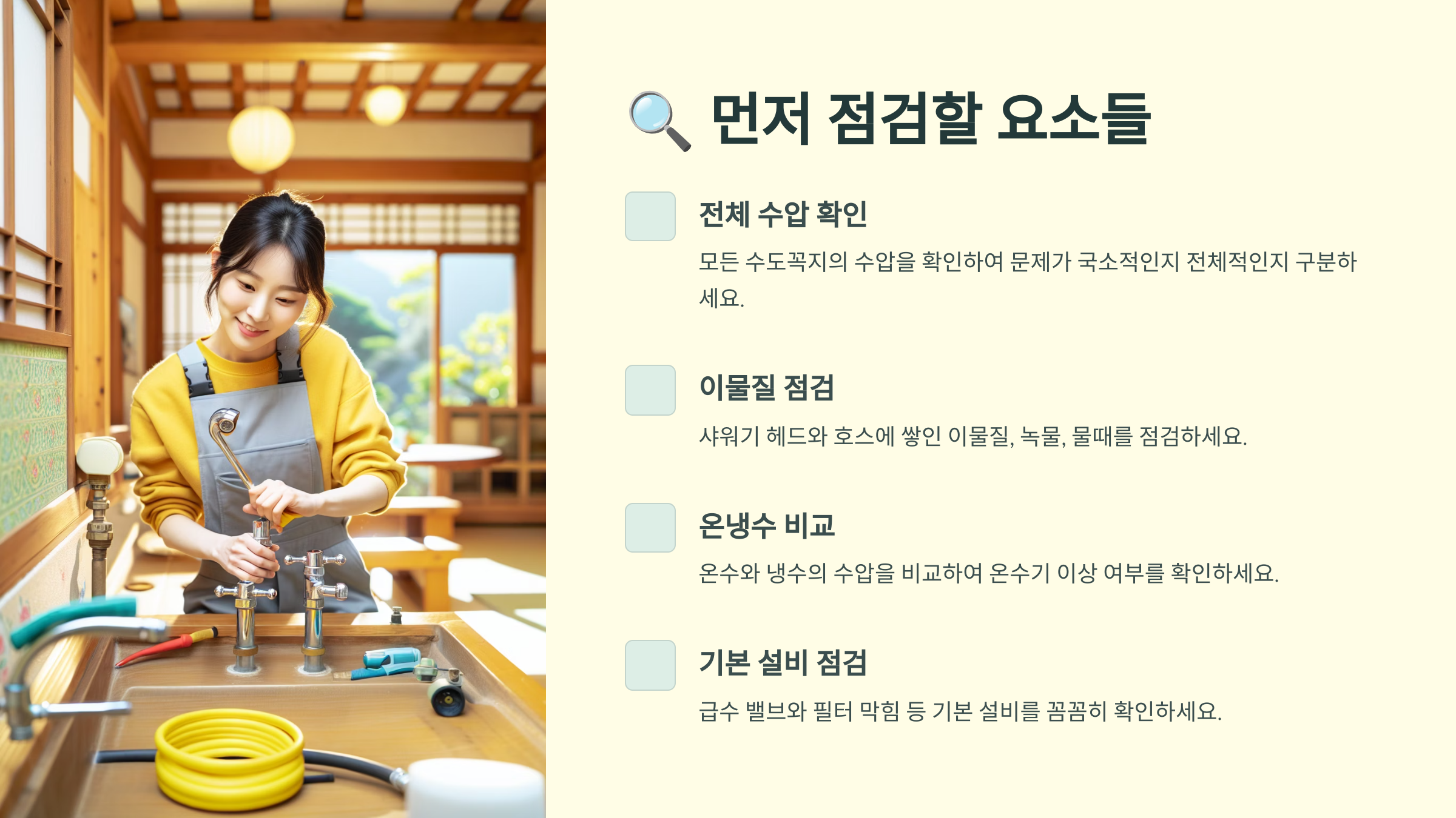 샤워기 수압이 약하다고 무작정 교체부터 할 필요는 없어요. 가장 먼저 해야 할 건 현재 설치된 샤워기의 상태와 수도 상황을 꼼꼼히 점검하는 거예요. 간단한 확인만으로도 수압 문제를 해결할 수 있는 경우가 많답니다.