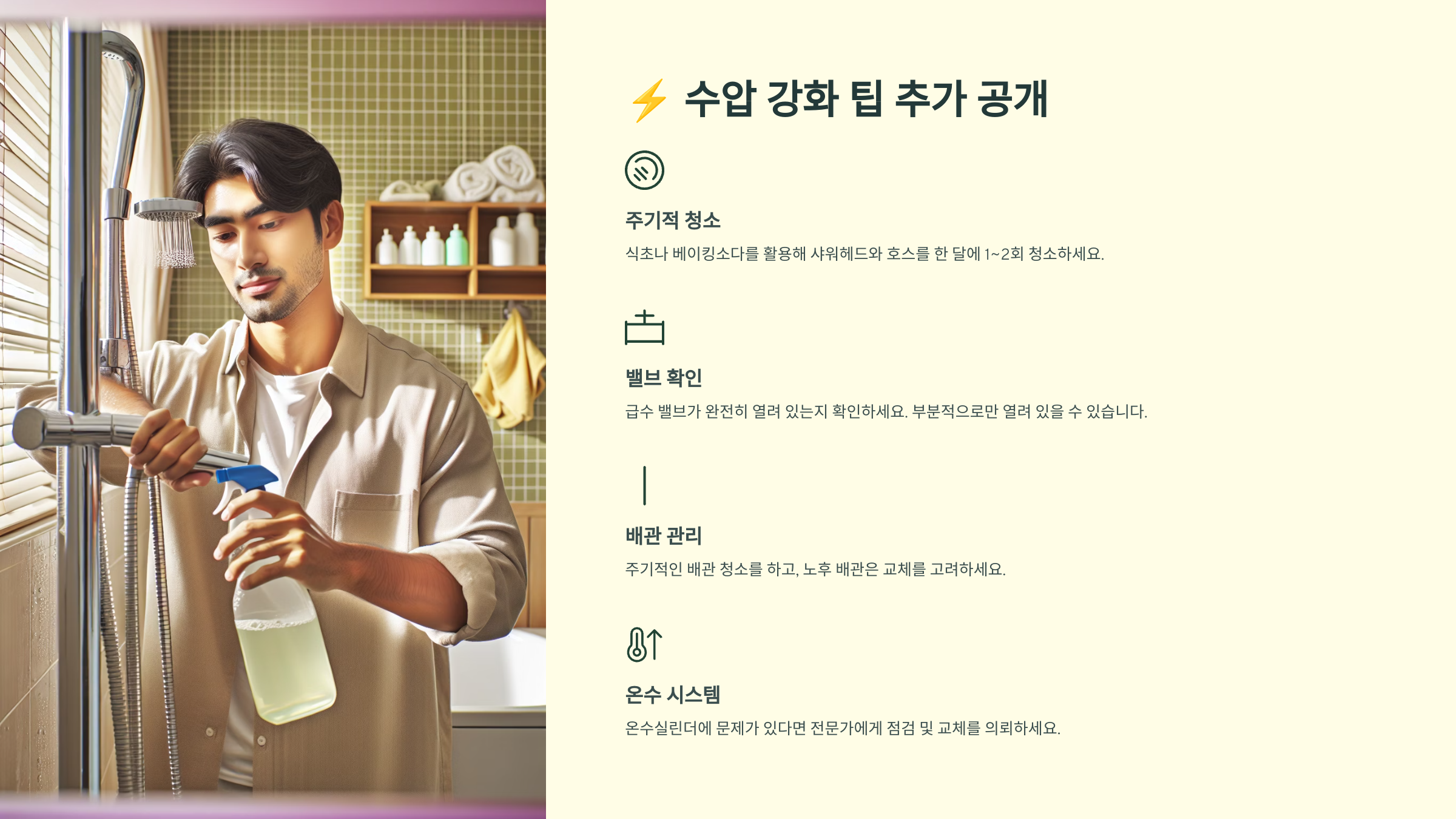 샤워기만 바꿨는데도 수압이 약하다고 느껴진다면? 걱정 마세요! 수압을 한층 더 빵빵하게 올릴 수 있는 비밀 팁들이 아직 남아 있어요. 이건 전문가들도 인정한 꿀팁이니 따라만 해보세요! 💡