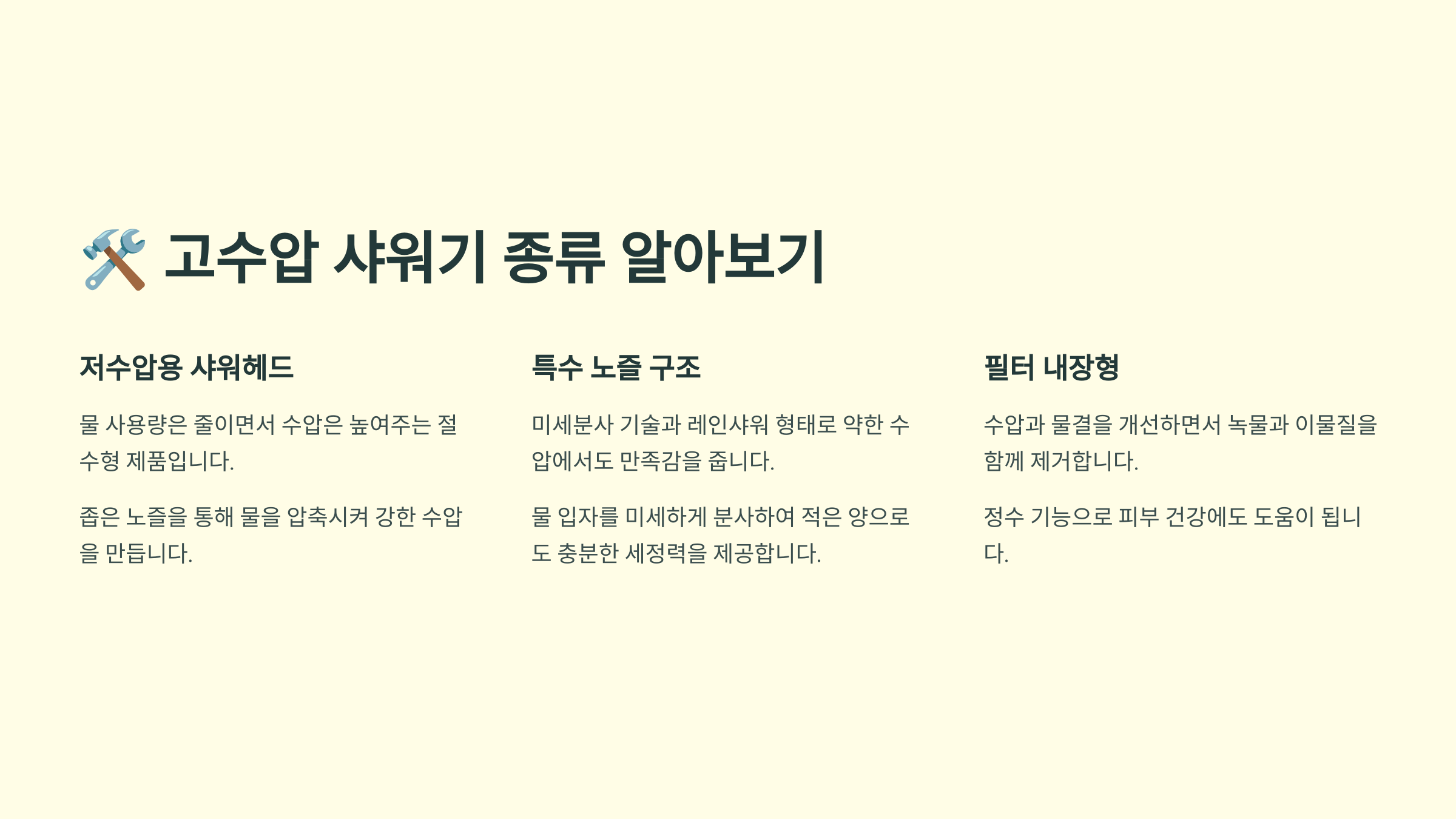 점검을 마쳤다면 이제 본격적으로 고수압 샤워기 종류를 알아볼 차례예요. 요즘은 기능도 다양하고 디자인도 예쁜 샤워기들이 많아서 선택의 폭이 넓어요. 단순히 물줄기만 세게 나오는 게 아니라, 절수 기능이나 필터 기능까지 갖춘 제품도 있어요.