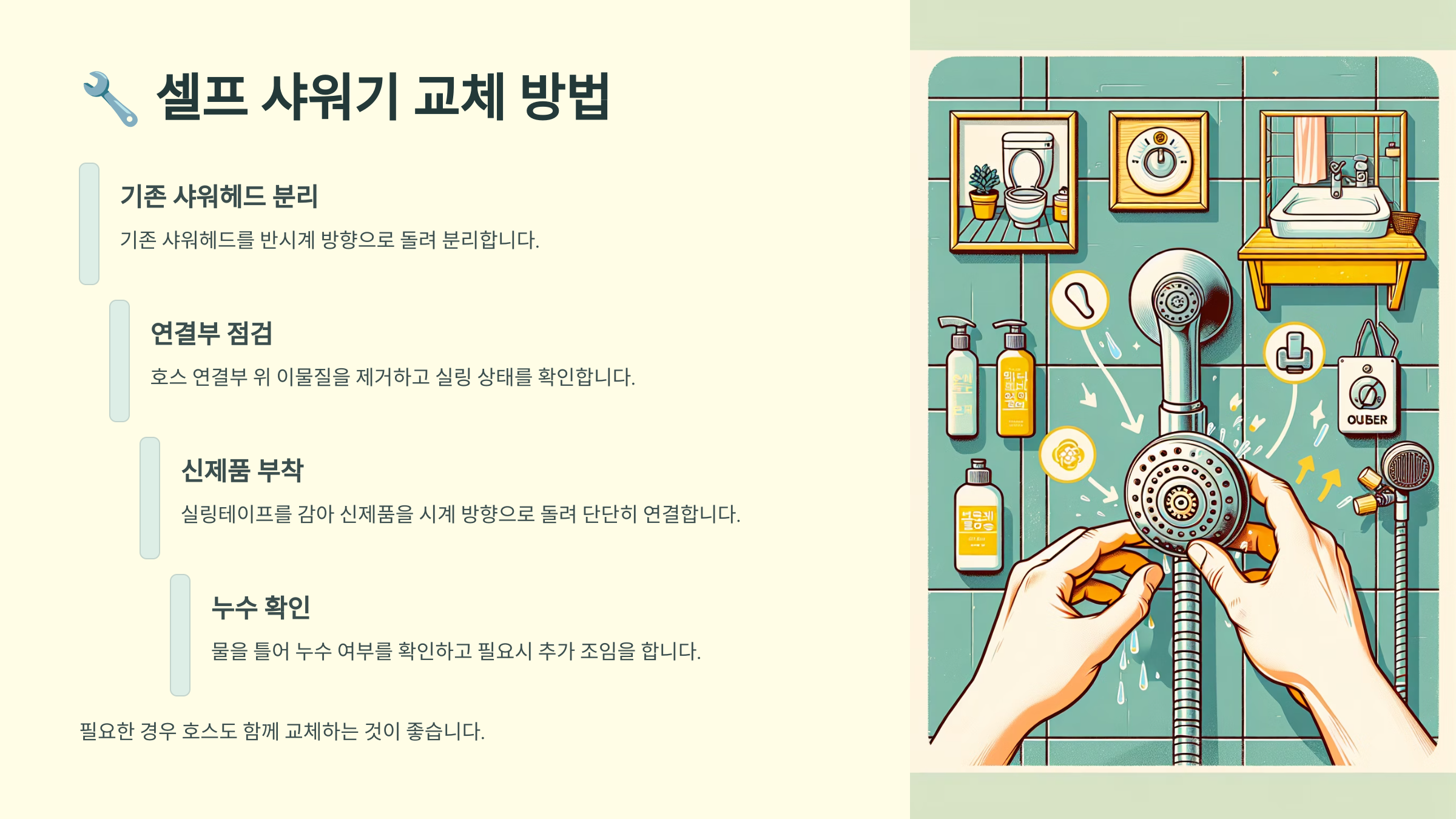 이렇게만 따라 하면 누구나 손쉽게 샤워기를 새걸로 교체할 수 있어요. 어려워 보이지만 실제로 해보면 굉장히 단순하고 직관적이랍니다!