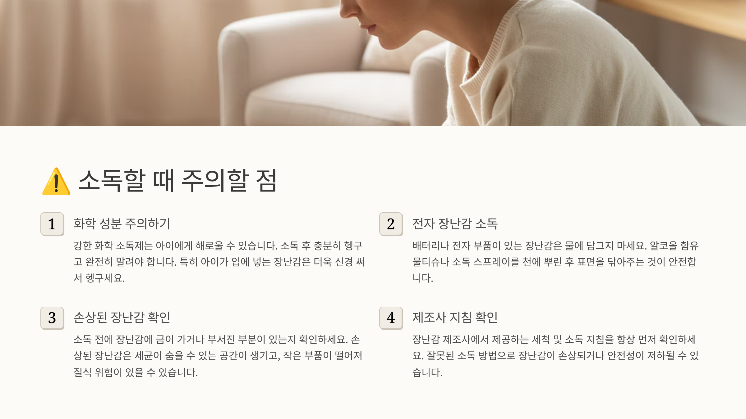 소독은 잘하면 든든한 보호막이 되지만, 잘못하면 아기 건강을 해칠 수 있어요. 아무리 좋은 소독 방법이라도 사용법을 지키지 않으면 효과가 없거나 오히려 독이 되기도 해요. 그래서 장난감 소독할 때 꼭 알아둬야 할 주의사항들이 있답니다.