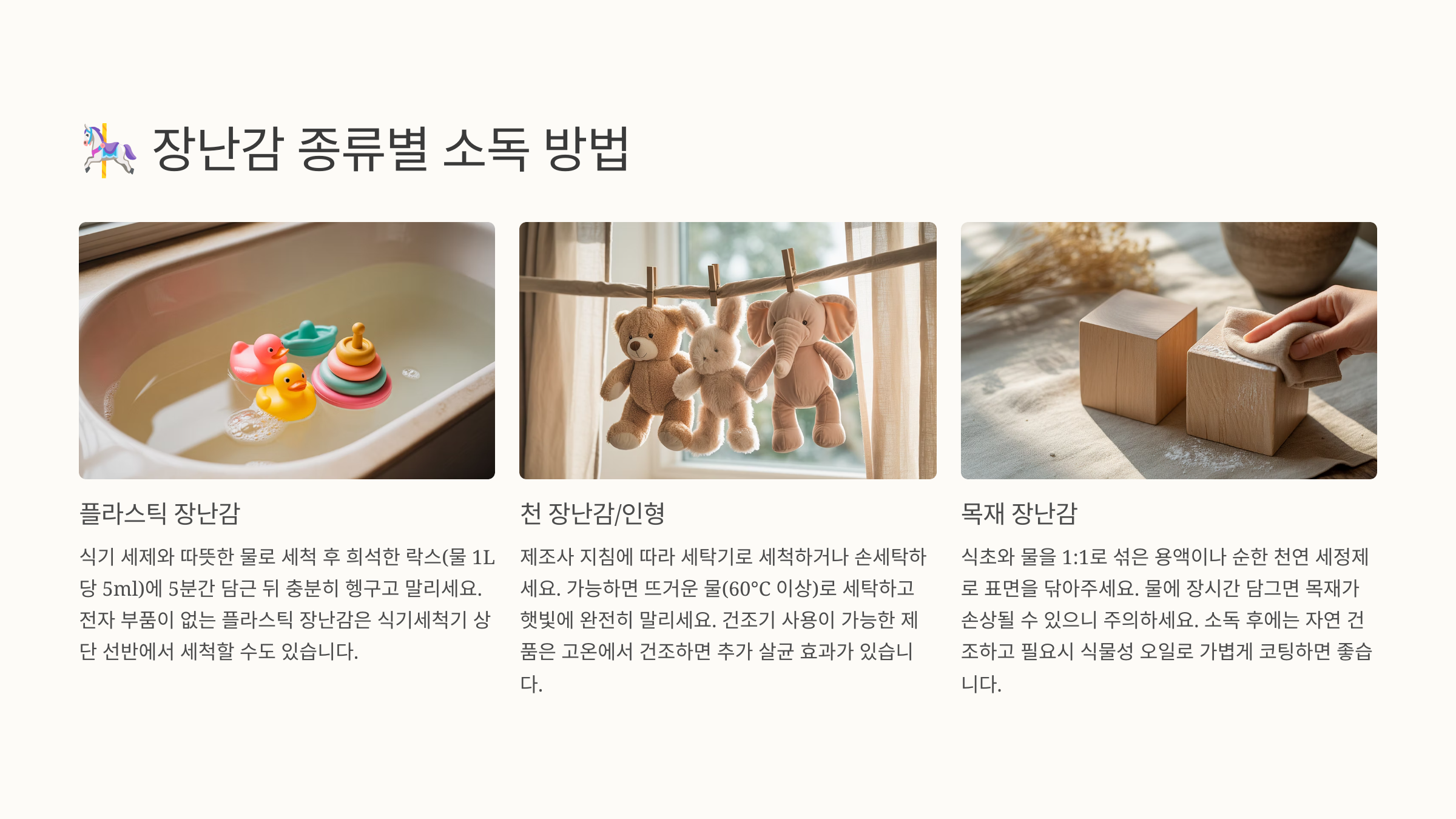 특히 플라스틱, 고무, 천 등 장난감의 재질에 따라 세균 번식률이 다르기 때문에 각각에 맞는 소독 방식이 필요해요. 내가 생각했을 때, 가장 중요한 건 아기 피부와 입에 닿는 물건은 화학적 자극이 없도록 자연친화적인 방식이 되어야 한다는 점이에요.