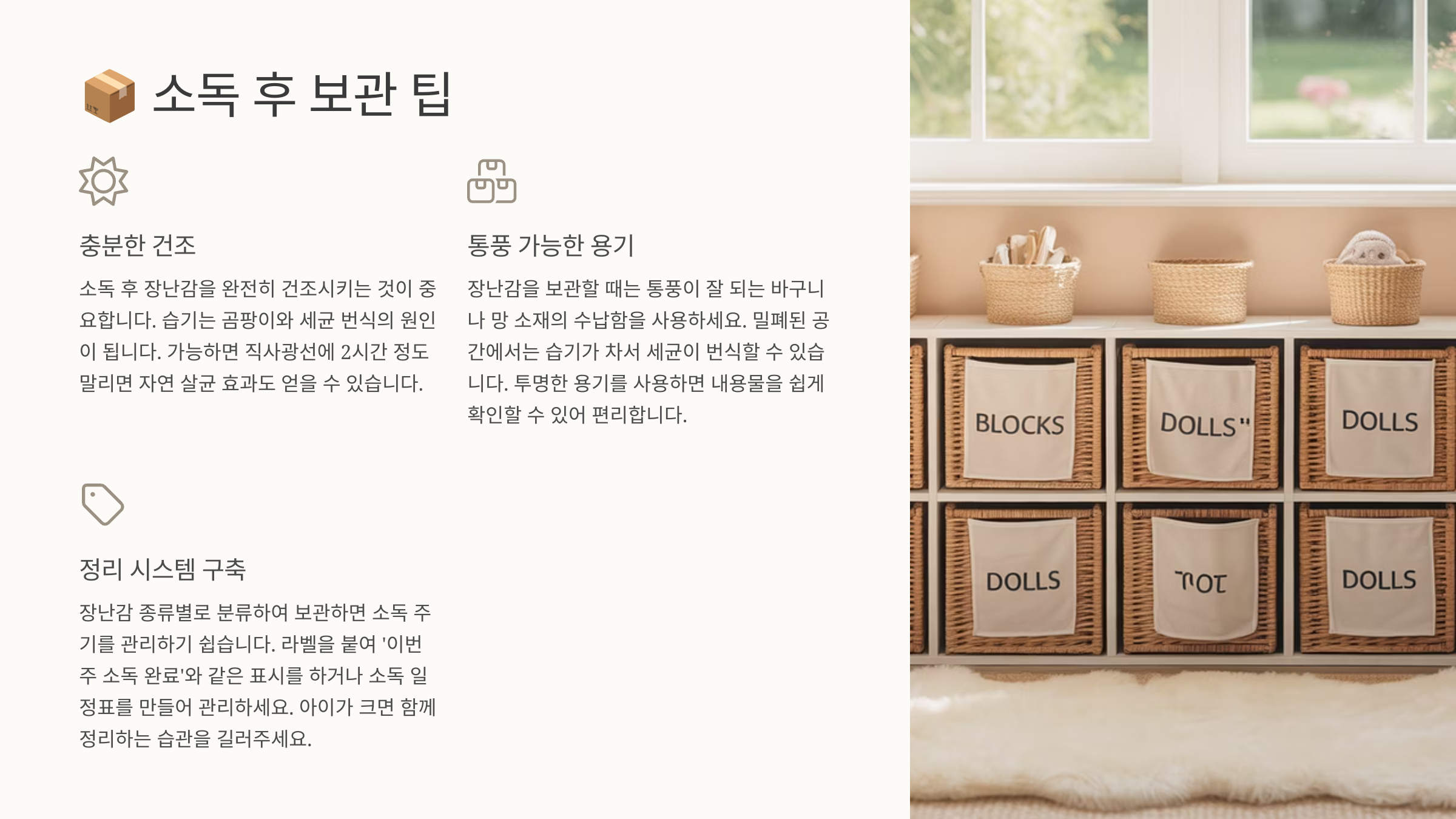 그리고 잊지 말아야 할 것이 ‘주기적인 점검’이에요. 보관만 해두고 방치하면, 오히려 미세먼지나 곰팡이가 생길 수 있어요. 최소한 2주에 한 번씩은 장난감 보관함을 열어 환기시키고, 필요하면 재소독하거나 다시 건조하는 과정이 필요해요.