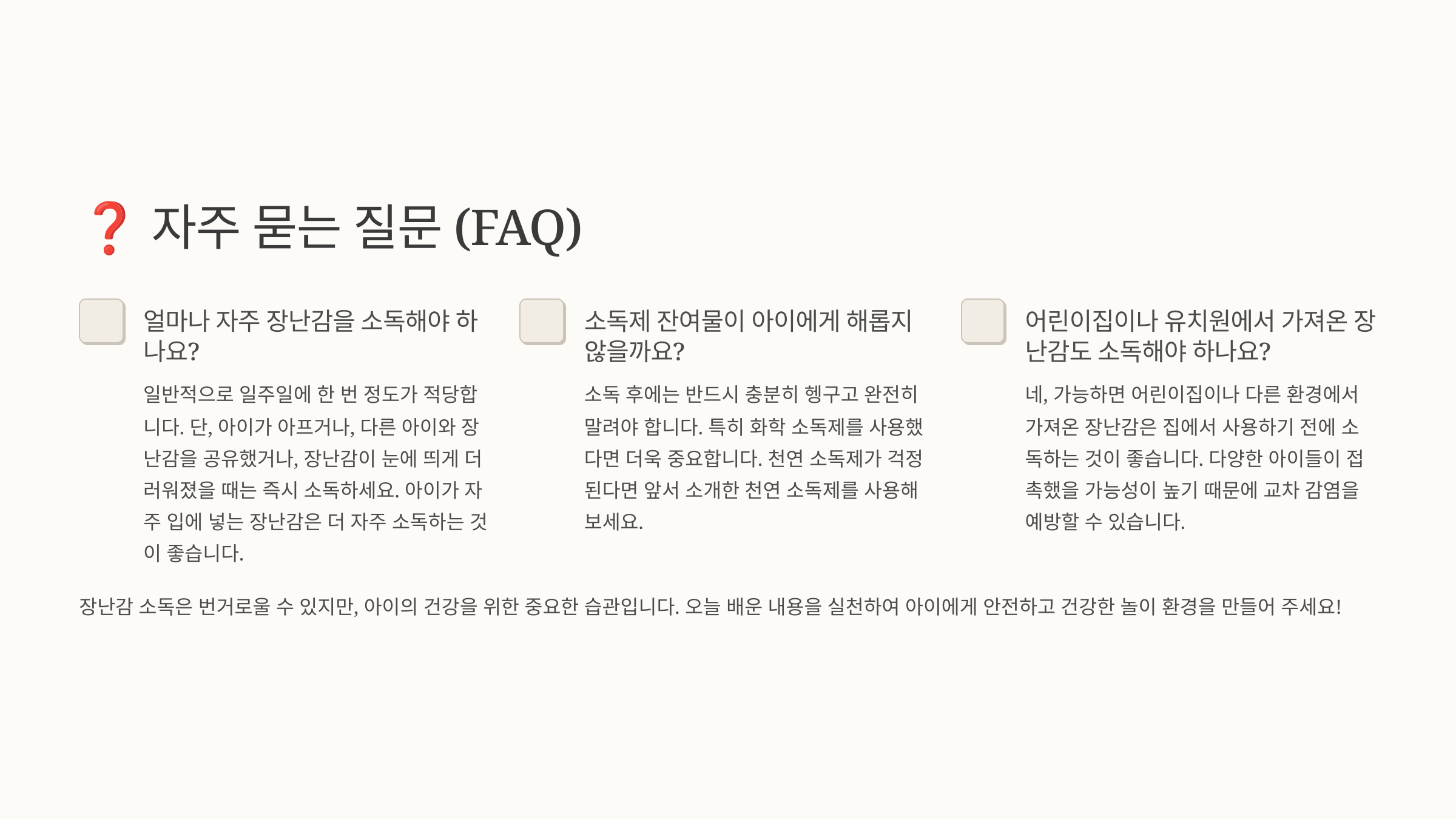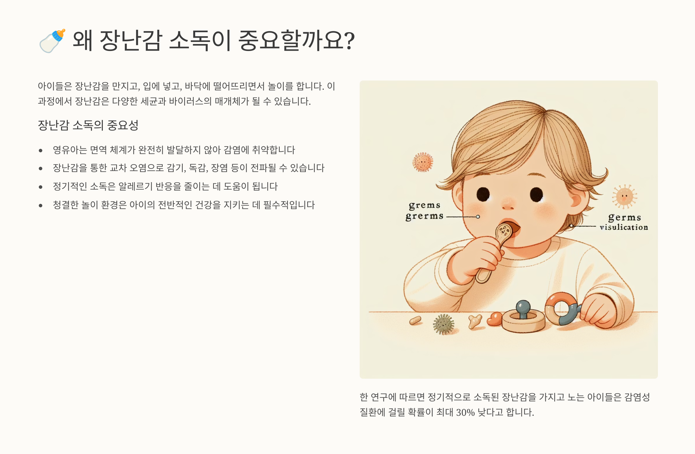 무조건 삶는 것만 고집하지 말고, 장난감의 특성과 우리 아이의 건강 상태를 고려한 ‘맞춤 소독법’을 적용해보세요. 전문가들도 ‘지속가능한 소독 루틴’이 아기의 면역력 향상에 도움이 된다고 강조해요.💪