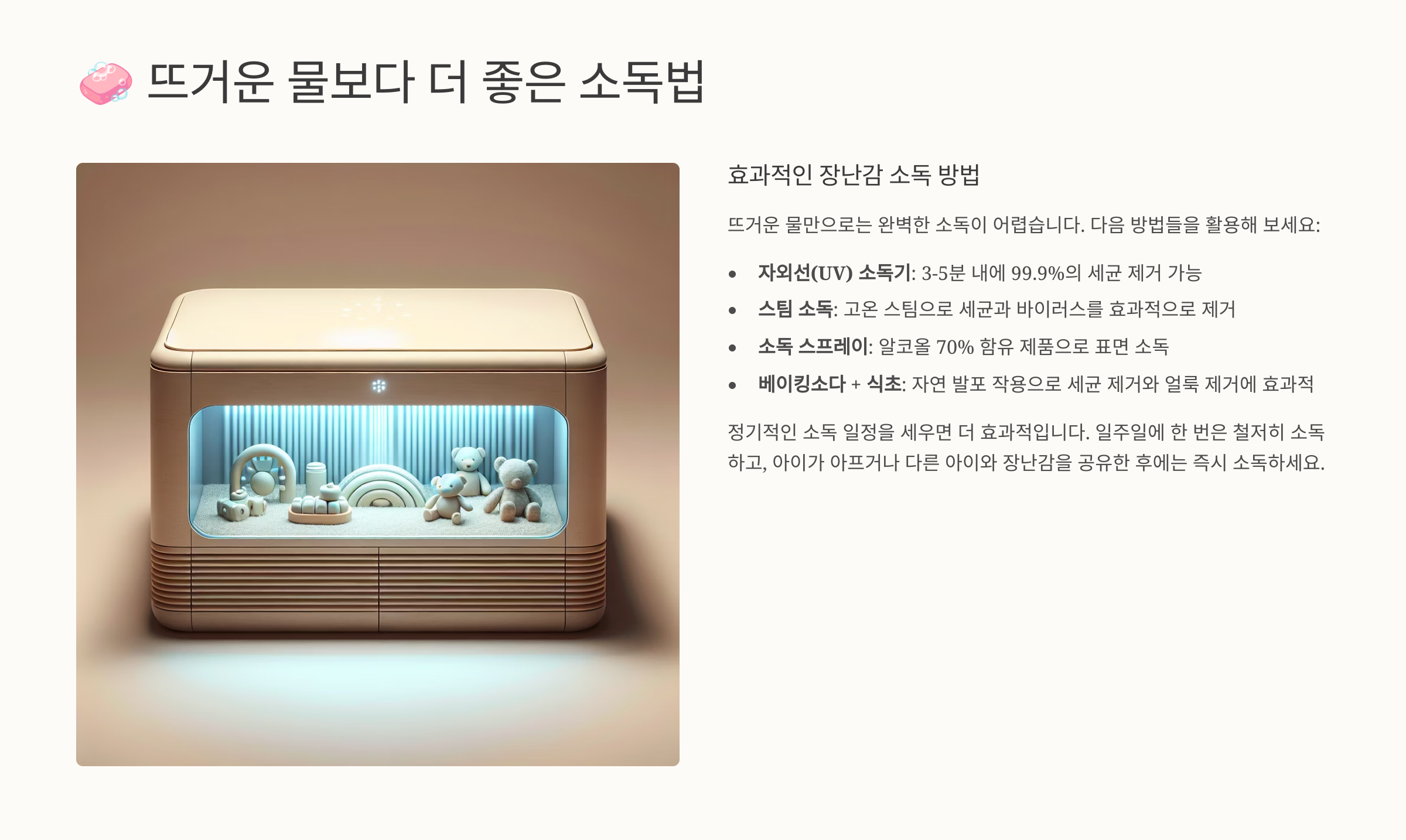 정리해보면, 뜨거운 물을 대체할 수 있는 방법들은 다양해요. 상황과 장난감 종류에 맞춰 적절하게 활용하면, 더 안전하고 위생적으로 관리할 수 있답니다.😊