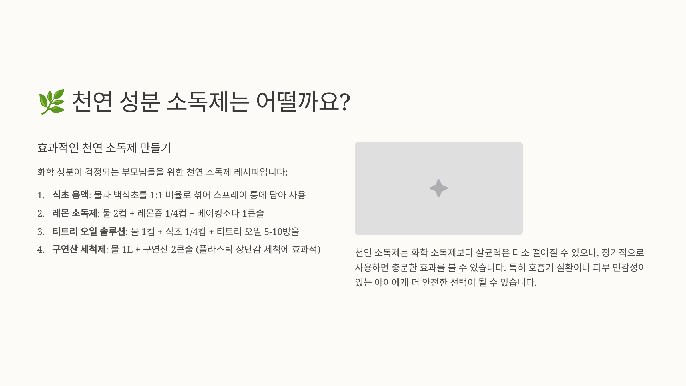 요즘 많은 부모님들이 화학 성분 대신 천연 성분 소독제를 찾고 있어요. 이유는 간단해요. 아기의 피부는 연약하고 예민하기 때문에 인공 향이나 합성 계면활성제 같은 자극이 적은 성분이 훨씬 안전하거든요. 그래서 자연 그대로의 재료를 활용한 소독법이 주목받고 있어요.