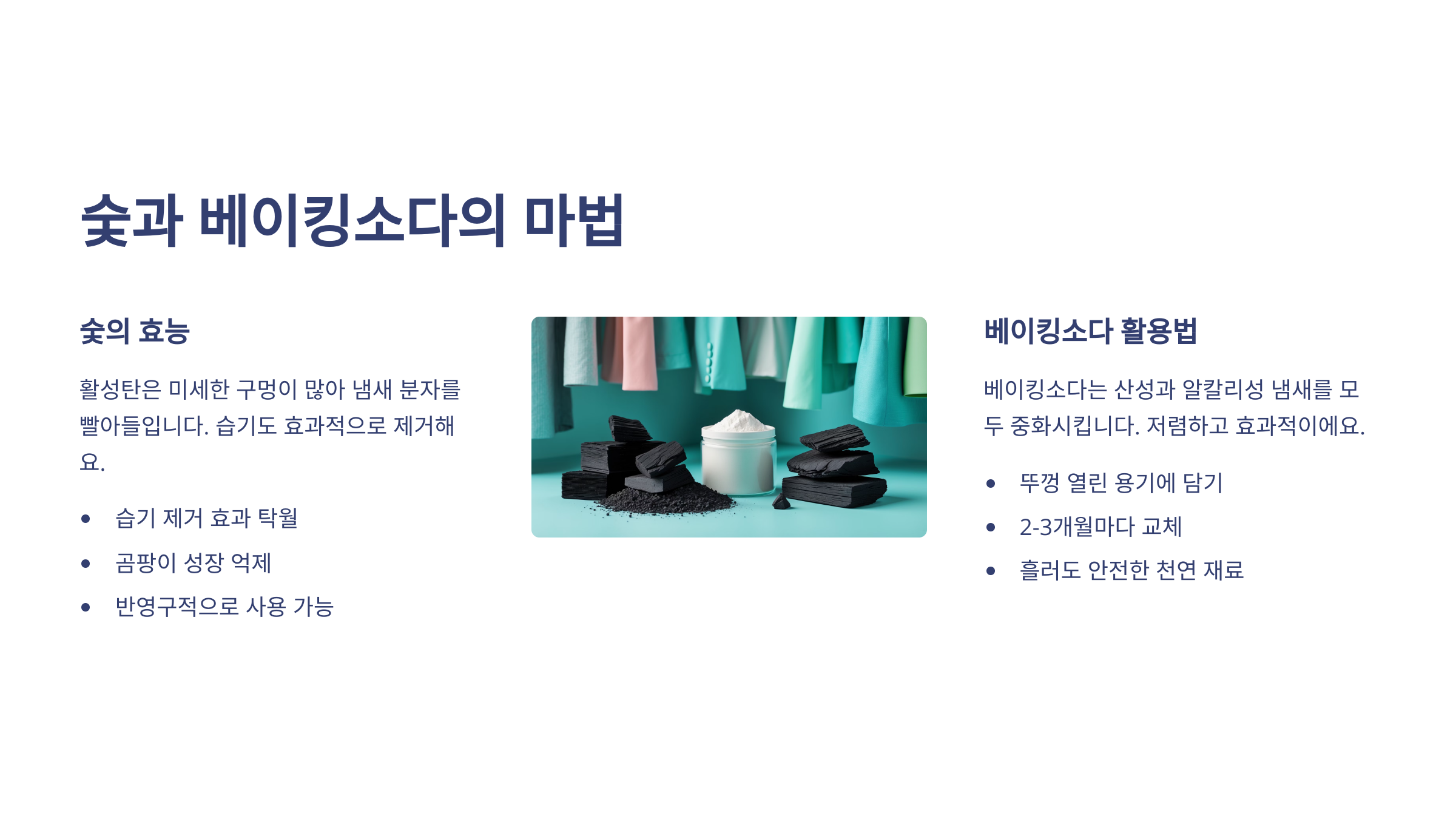 | 베이킹소다 | 습기+냄새 제거 동시 가능 | 주기적 교체 필요 |
