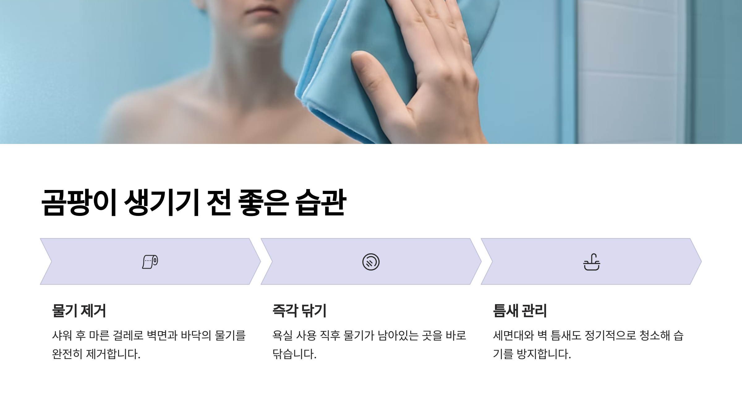 곰팡이는 생긴 뒤에 없애는 것보다 처음부터 생기지 않도록 하는 게 훨씬 쉬워요. 일상 속에서 실천할 수 있는 습관만 잘 들여도 곰팡이와는 안녕할 수 있어요!