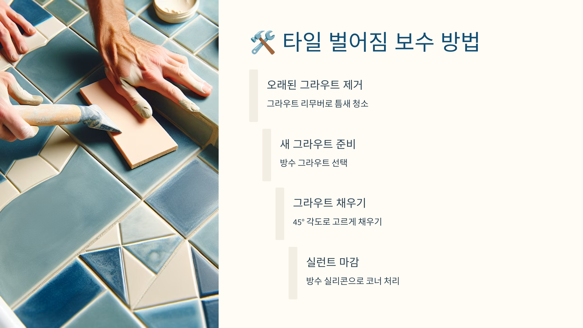 타일 사이 벌어진 틈은 시간이 지날수록 넓어지고, 물이 고이면 곰팡이뿐 아니라 누수까지 이어질 수 있어요. 그래서 벌어짐이 보이기 시작하면 가능한 빨리 보수를 시작하는 게 가장 좋아요.