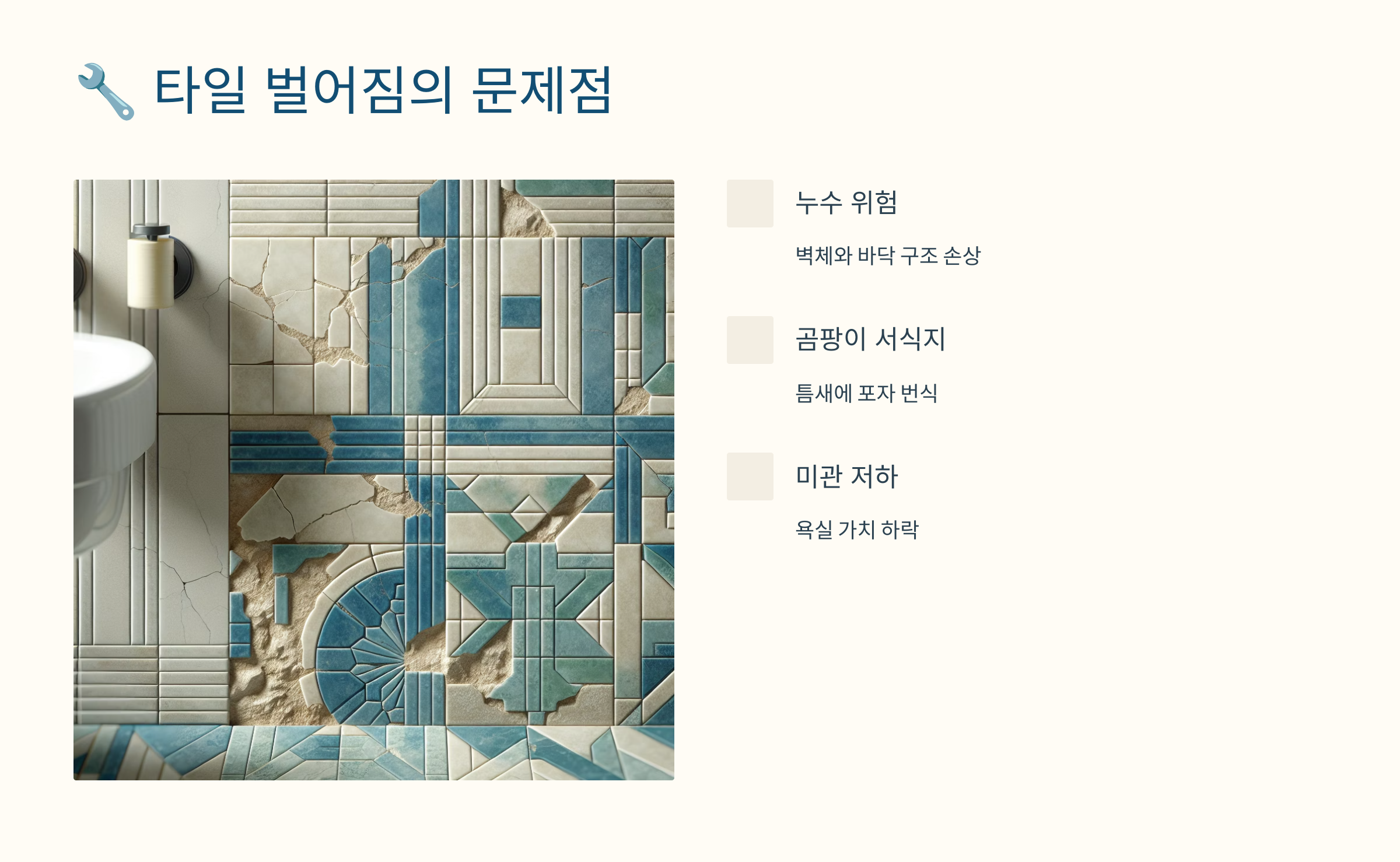타일 사이가 벌어지면 그 틈으로 물이 스며들 수 있어요. 이 물은 곰팡이의 서식처가 되기도 하고, 바닥 속까지 스며들어 하부 구조물에 손상을 줄 수 있어요. 나중엔 누수나 곰팡이 악취로까지 이어진답니다.