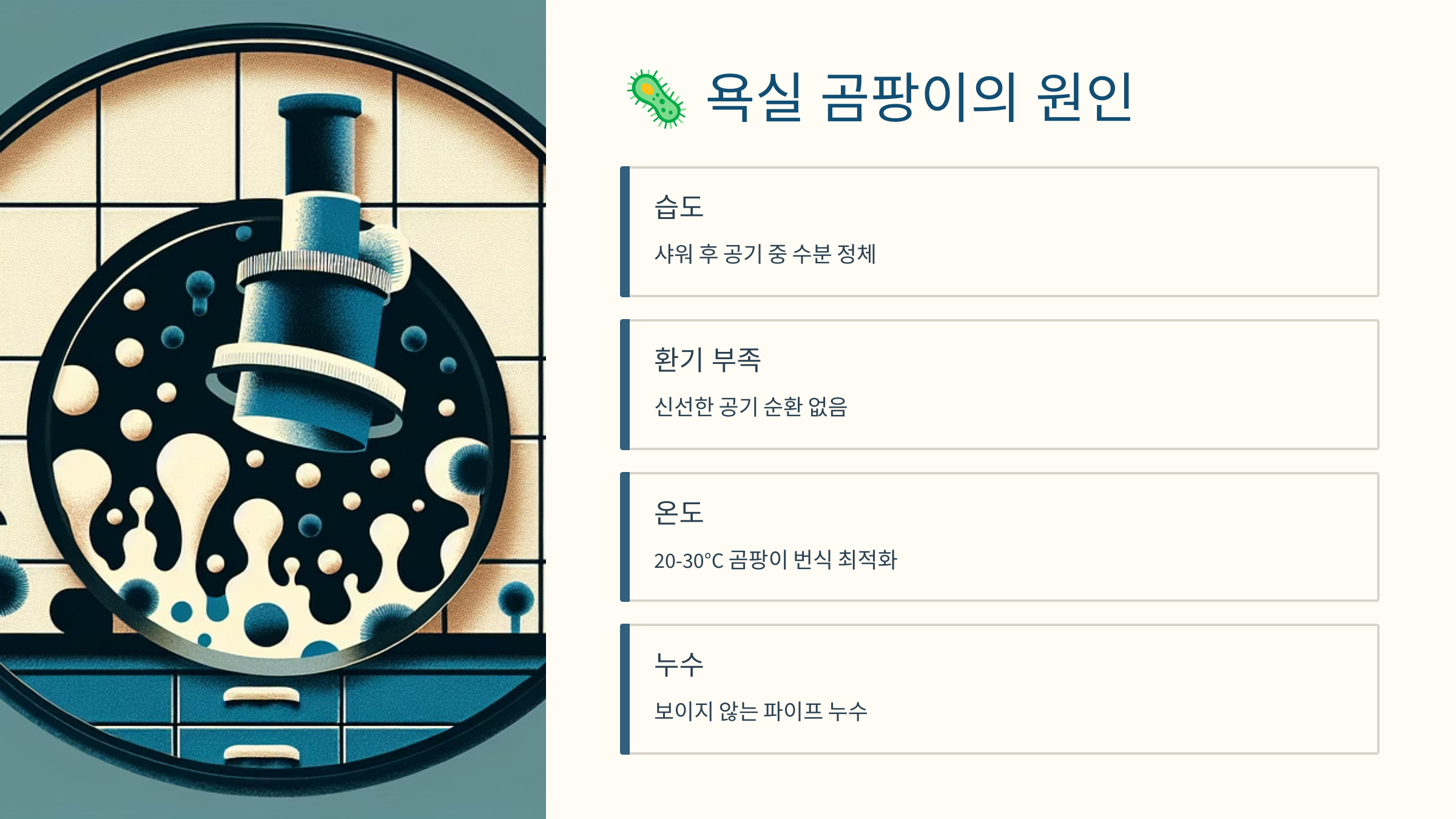 욕실 곰팡이는 고온다습한 환경에서 아주 빠르게 자라요. 샤워 후 환기를 제대로 하지 않으면 벽면과 타일 줄눈, 실리콘 부분에 수분이 남아 곰팡이가 번식하게 된답니다.