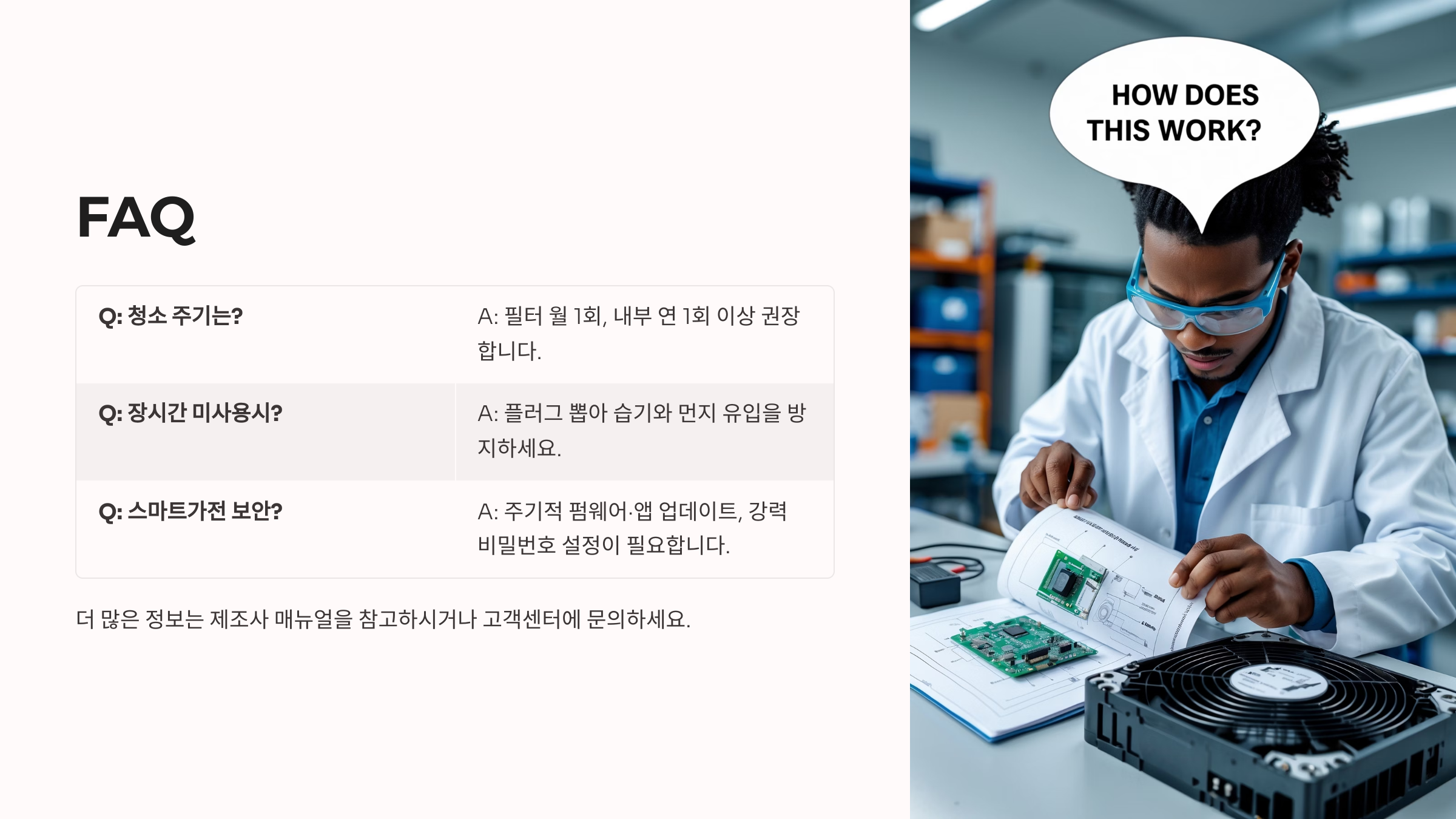 A1. 제품마다 다르지만, 최소 한 달에 한 번은 청소하는 게 좋아요. 에어컨은 계절마다, 소형가전은 월 1회 정도로 관리해보세요.