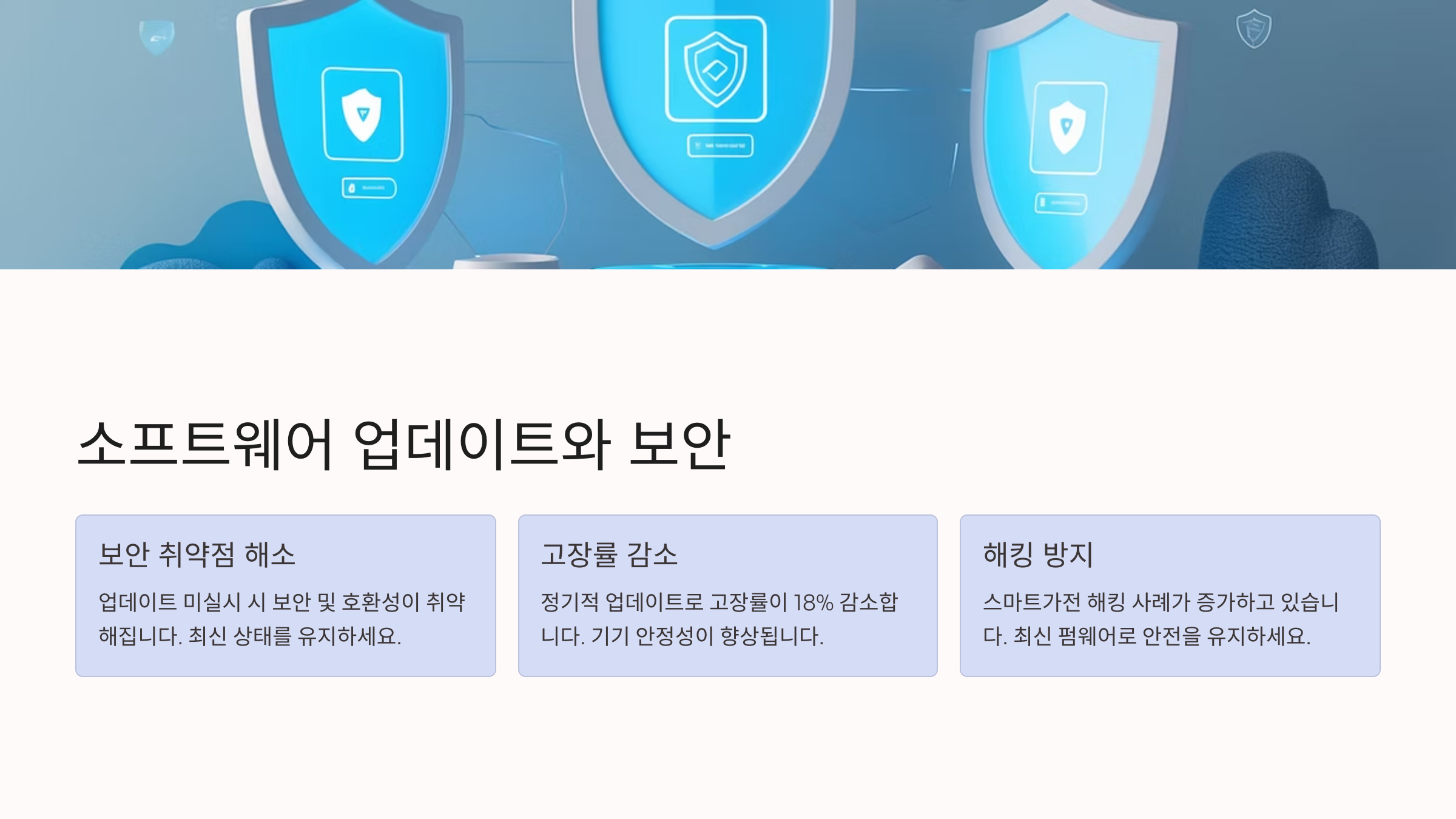 A5. 보안 취약점을 막고, 성능을 향상시키는 데 필수예요. 해킹 위험이 있는 스마트가전은 꼭 업데이트하세요!