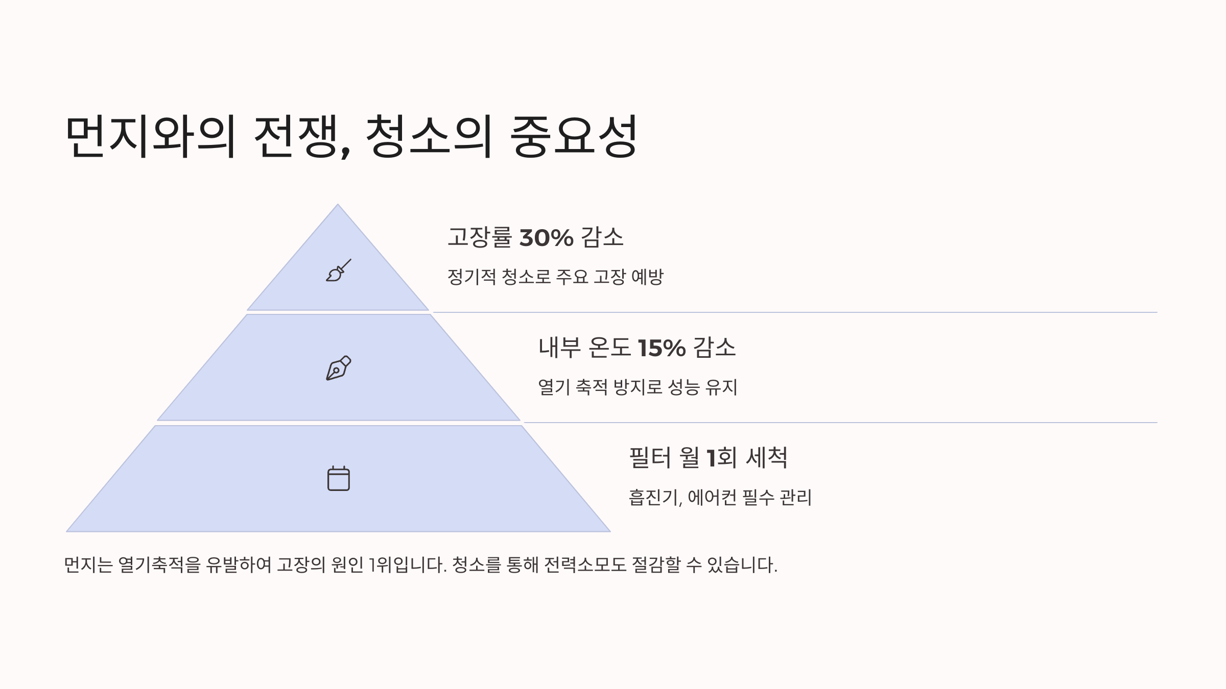 위 표처럼 정기적으로 관리하면, 먼지로 인한 고장을 확실히 줄일 수 있어요. 👍