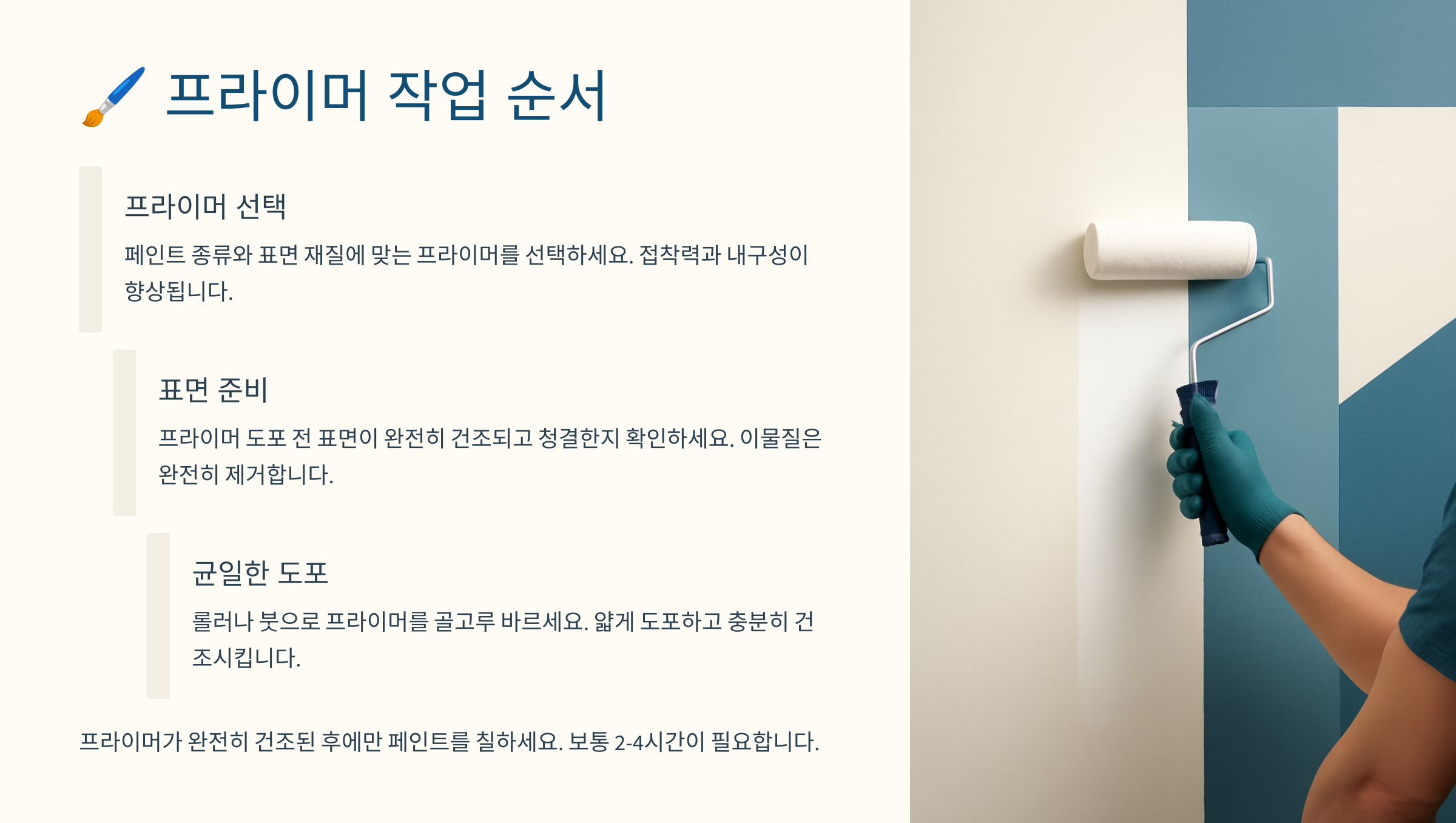프라이머는 페인트칠 전 꼭 필요한 밑작업이에요. 이 과정을 생략하면 페인트가 잘 안 붙거나 쉽게 벗겨질 수 있어요. 특히 표면이 거칠거나 흡수가 심한 벽에는 더더욱 필수랍니다. 🧪