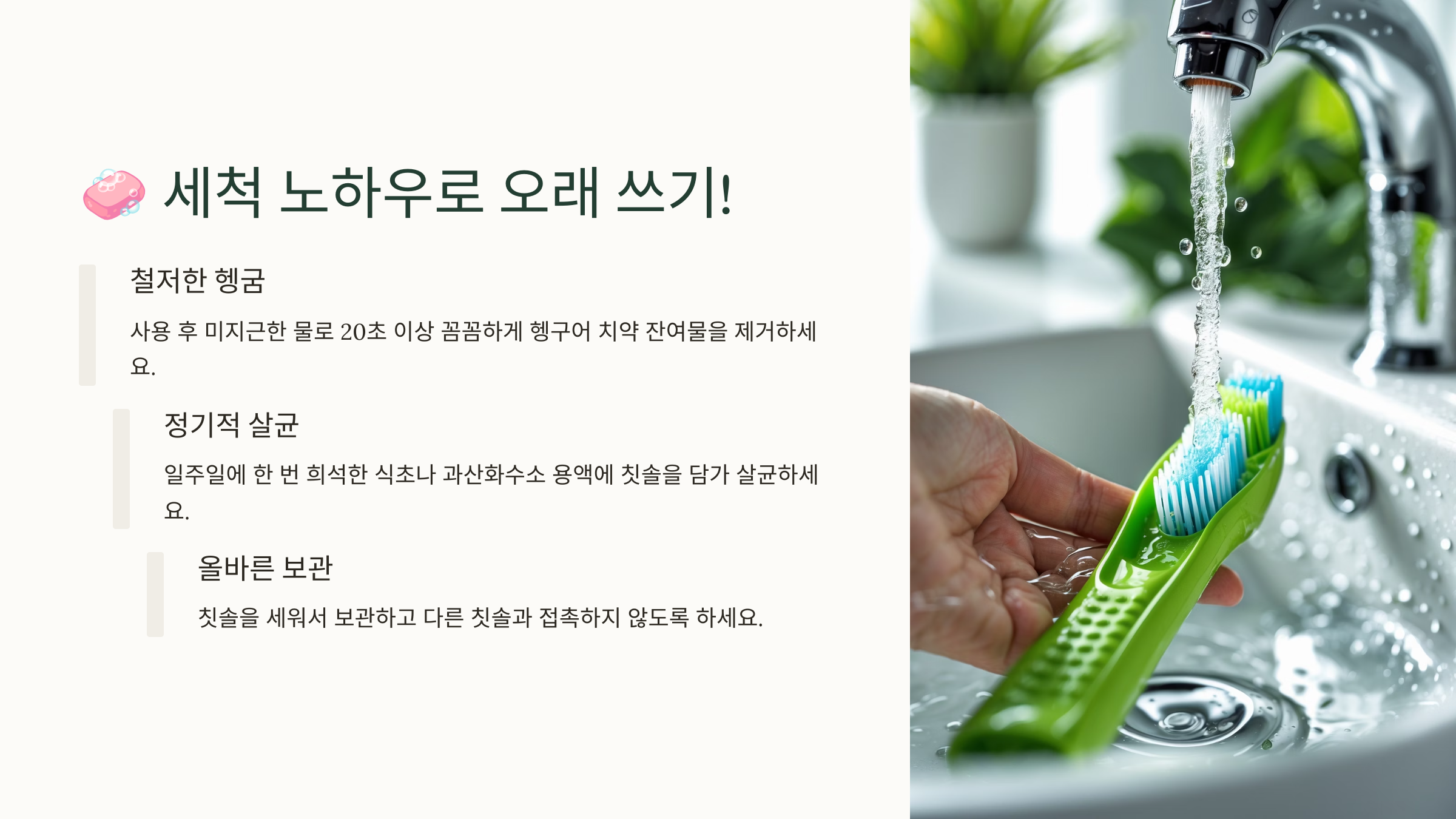 칫솔을 오래 쓰고 싶다면 단순히 물에 헹구는 걸로는 부족해요. 주기적인 ‘깊은 세척’이 필요하답니다. 구강 내 세균이 칫솔에 남기 때문에 이를 제거해주는 과정이 꼭 필요해요.