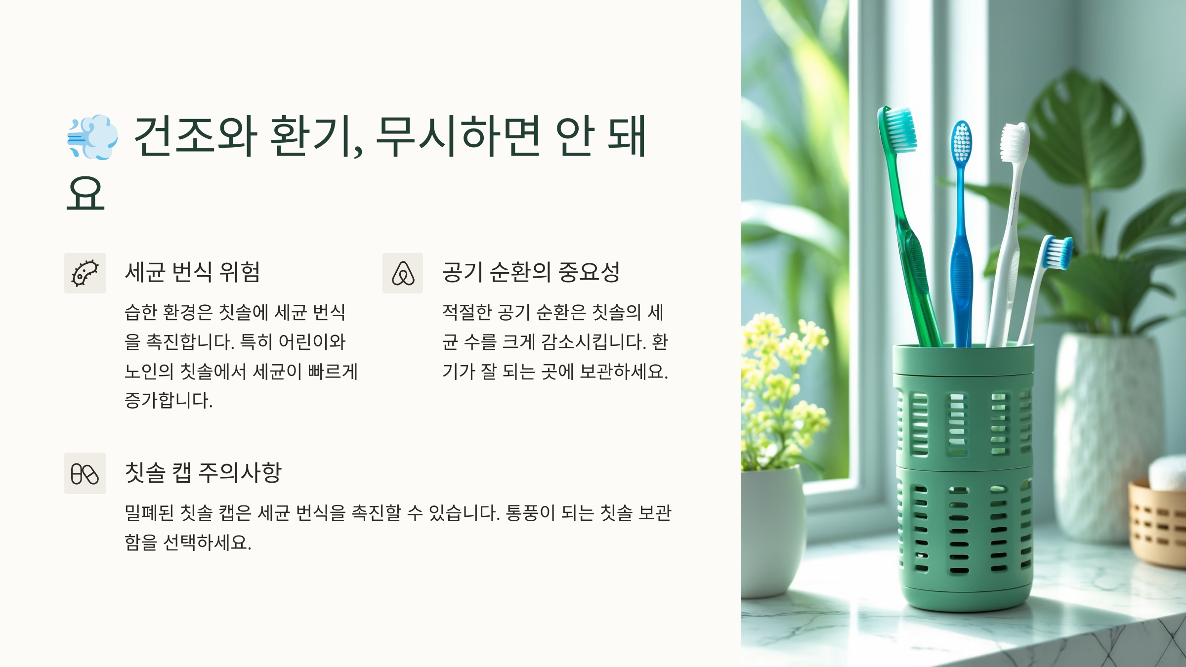 칫솔을 오래 쓰고 싶다면 ‘건조 상태’를 꼭 확인해야 해요. 사용 후 물기만 털고 컵에 꽂아두는 방식은 오히려 세균 번식을 촉진할 수 있어요. 특히 통풍이 안 되는 욕실 환경에서는 더 위험하죠.