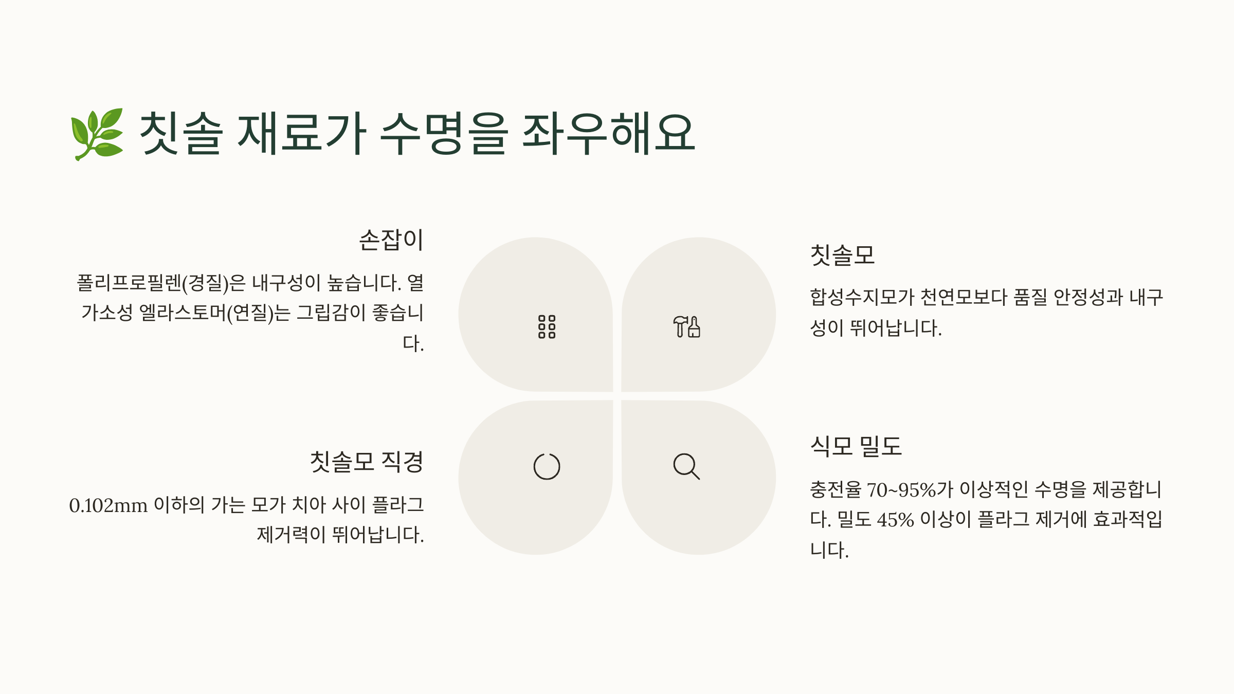 칫솔의 재료는 수명과 직결되는 요소예요. 특히 칫솔모의 재질이 중요한데, 가장 흔한 소재는 나일론이에요. 나일론은 탄성이 좋고 세균 번식이 상대적으로 적어서 위생적으로도 적합하죠.