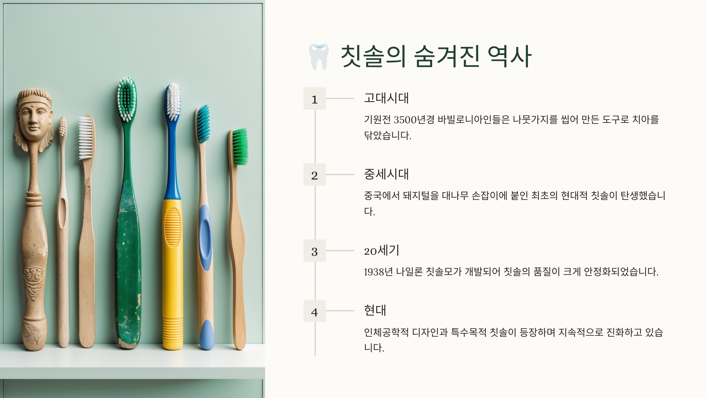 칫솔의 시작은 무려 기원전 3000년경 고대 이집트에서 발견된 씹는 막대기예요. 이들은 야자나무 뿌리나 향나무 가지를 씹어 치아를 닦았죠. 이후 중국에서는 기원전 1600년 무렵 돼지털을 대나무에 묶어 사용하기 시작했어요. 이게 우리가 아는 칫솔의 원형이에요.