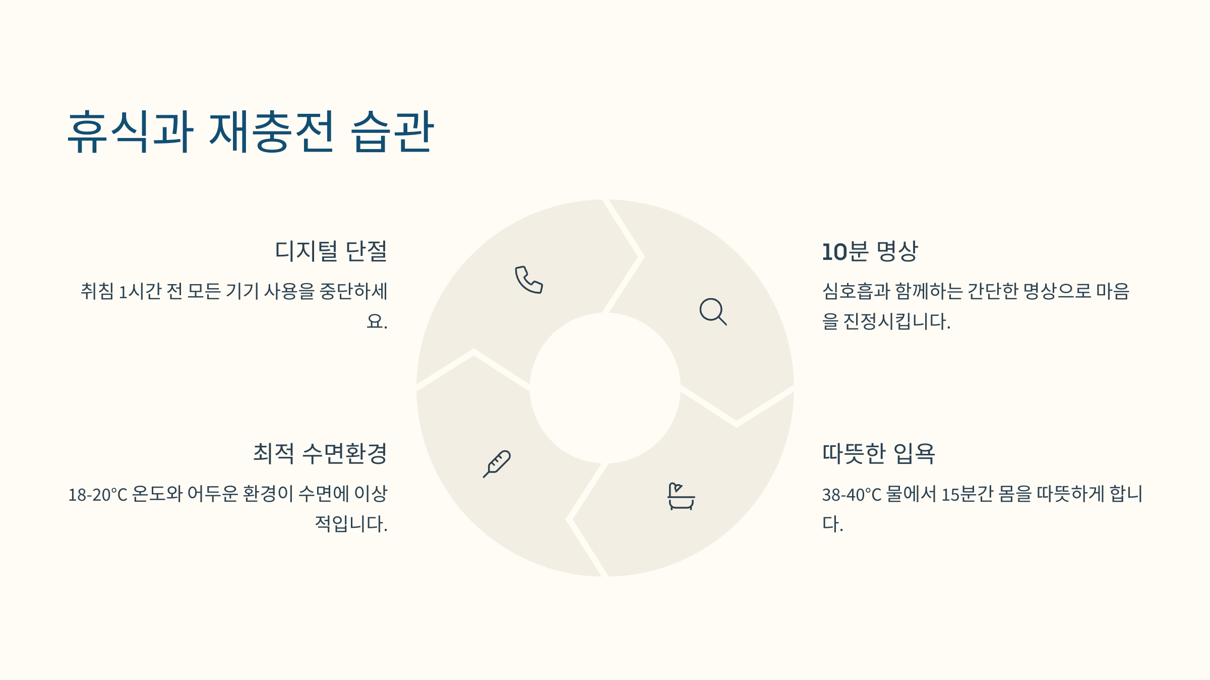 휴식의 마지막 단계는 바로 수면 준비예요. 달인들은 잠들기 1시간 전에는 스마트폰을 멀리 두고, 잔잔한 음악을 틀거나 책을 읽는 것으로 마음을 정리해요. 이렇게 하면 숙면의 질이 달라져서, 아침이 훨씬 상쾌해지죠! 🌙