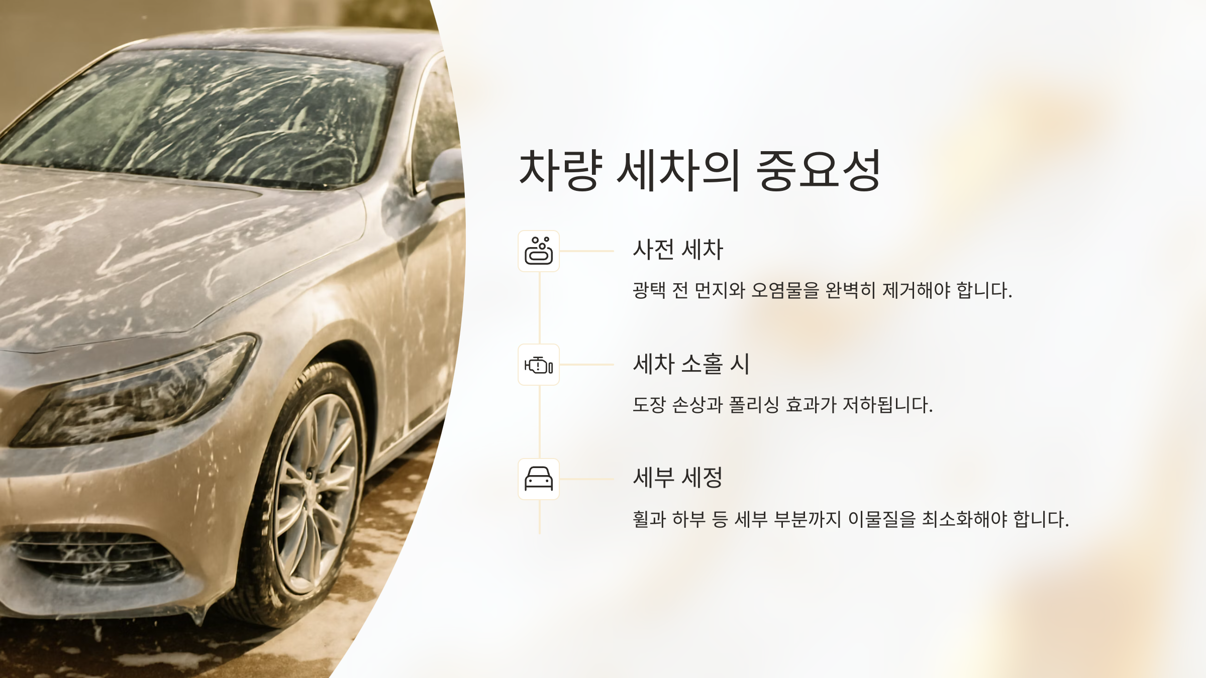 셀프 광택에서 절대로 생략하면 안 되는 단계가 바로 ‘세차’예요. 그냥 물 뿌리고 수건으로 닦는 수준이 아니라, 도장면 위의 미세한 오염물까지 완벽히 제거하는 정밀한 작업이 필요해요. 이 과정을 건너뛰면 아무리 고급 폴리싱 제품을 써도 좋은 결과를 얻기 어렵답니다.