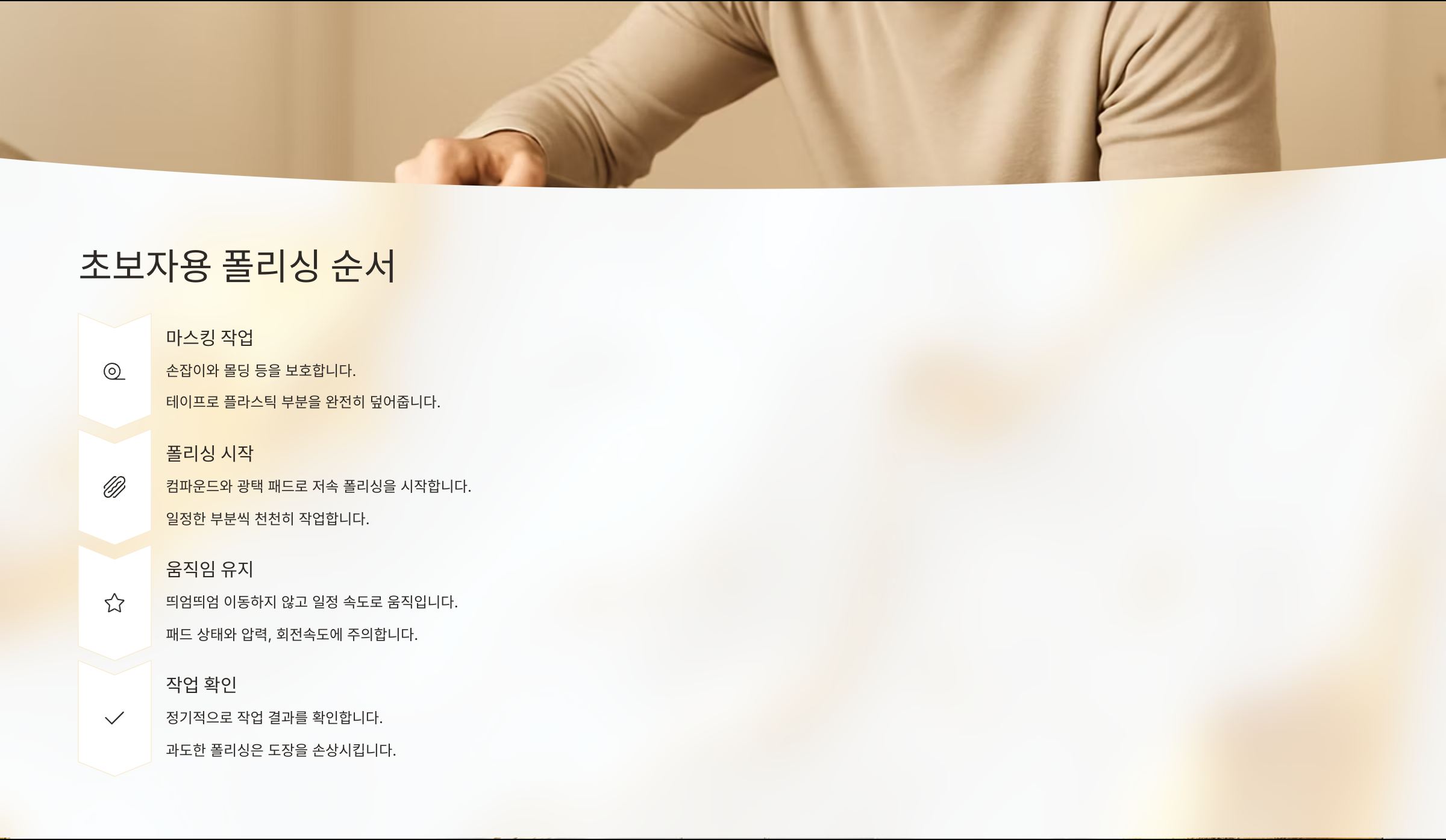 | 2. 패드 선택 | 폴리싱/피니싱용 부드러운 패드 추천 |
